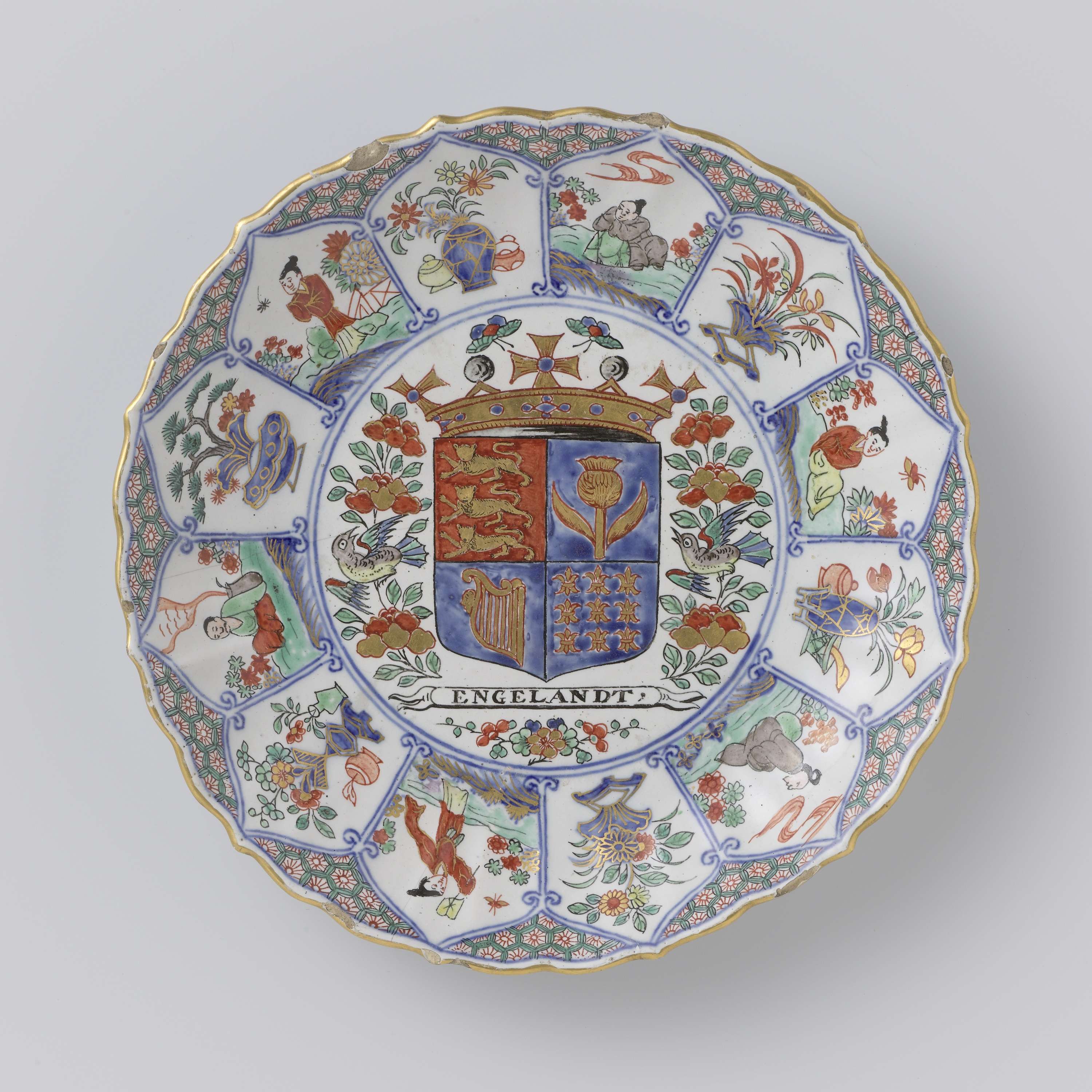 Bord van faience. Veelkleurig beschilderd met een gefantaseerd wapen van Groot-Brittannië. (Nederlands)