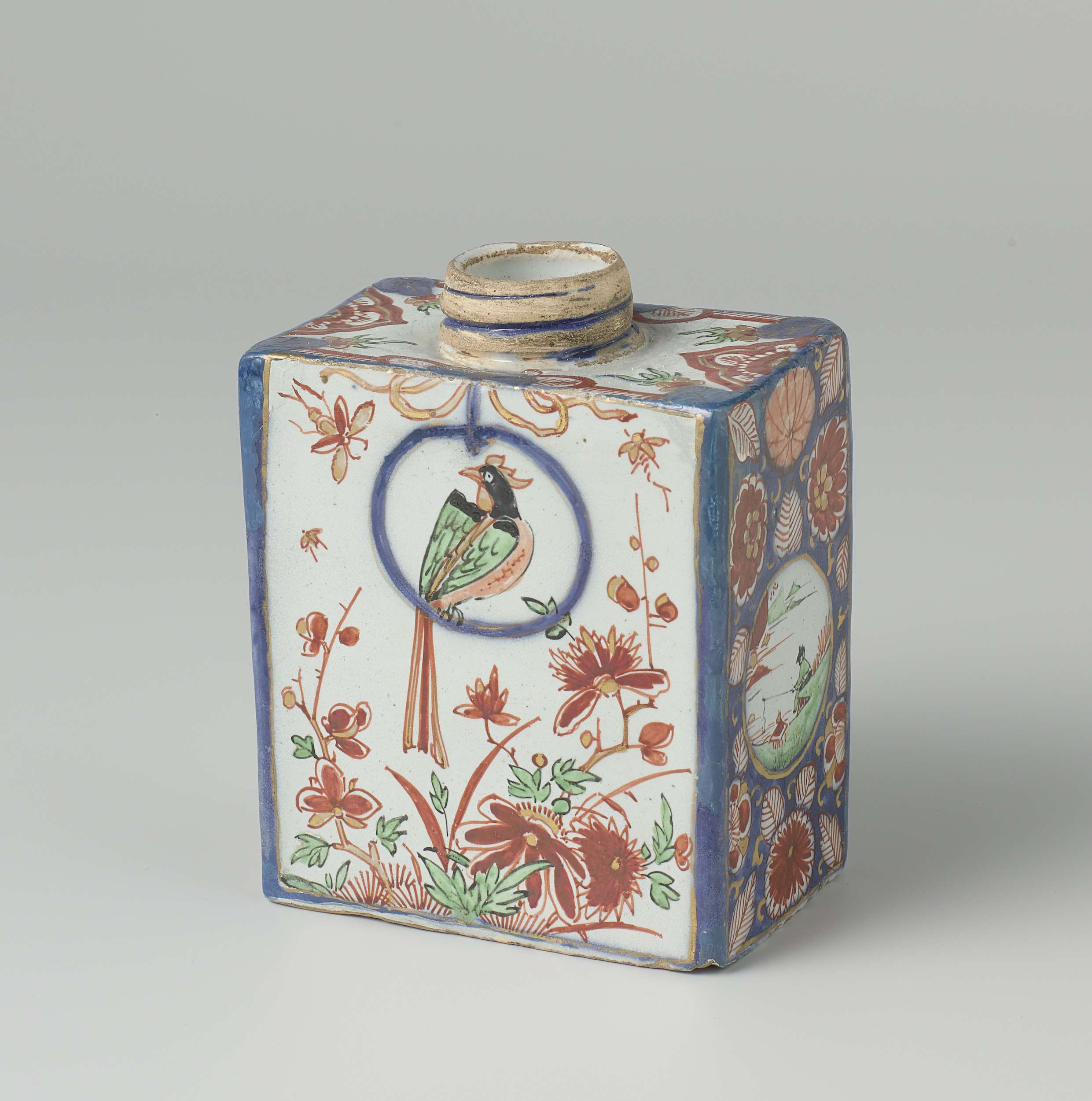 Theebus van faience. Veelkleurig beschilderd met landschapjes, bloemdecoraties en aan de voorzijde een papegaai in een ring. (Nederlands)