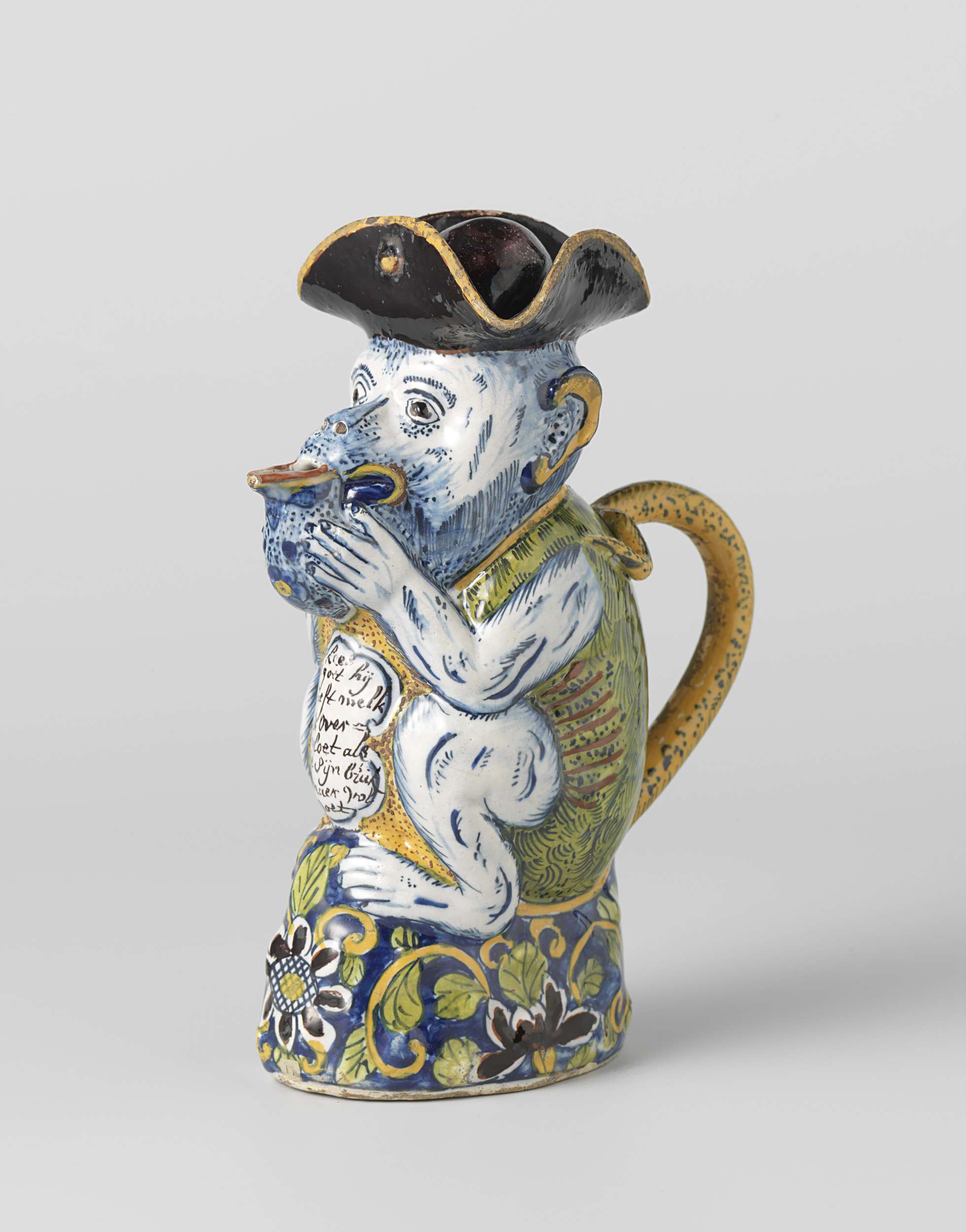 Melkkan van faïence, in de vorm van een drinkende aap. Op zijn buik het opschrift: kees is goet hij geeft melk in overvloet als je sijn buik maar vol doet. Met losse deksel. (Nederlands)