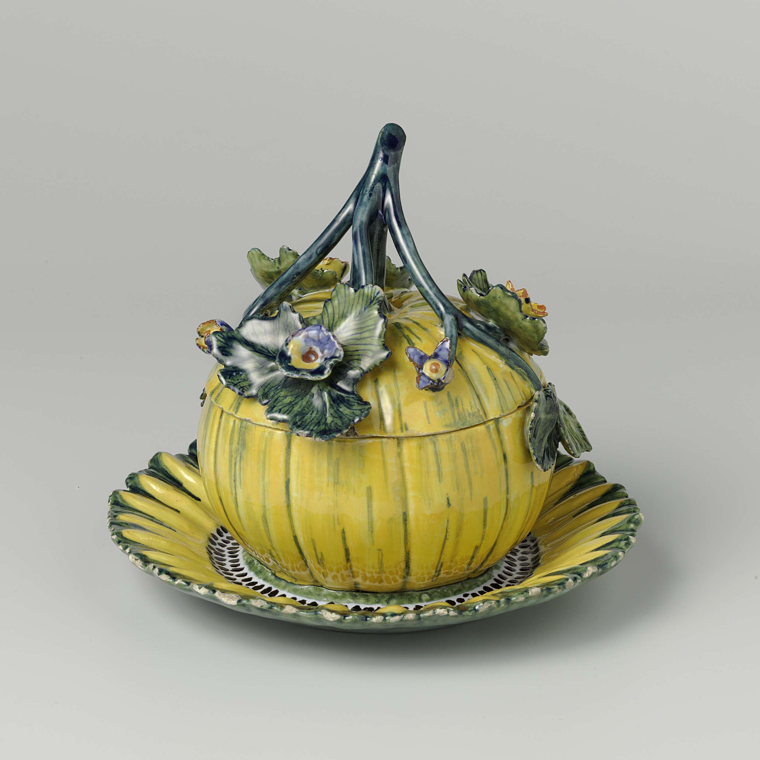 doos van faience. Bestaande uit een bakje op een onderschotel en een deksel. De onderschotel heeft de vorm van een zonnebloem, bak en deksel van een meloen. (Nederlands)