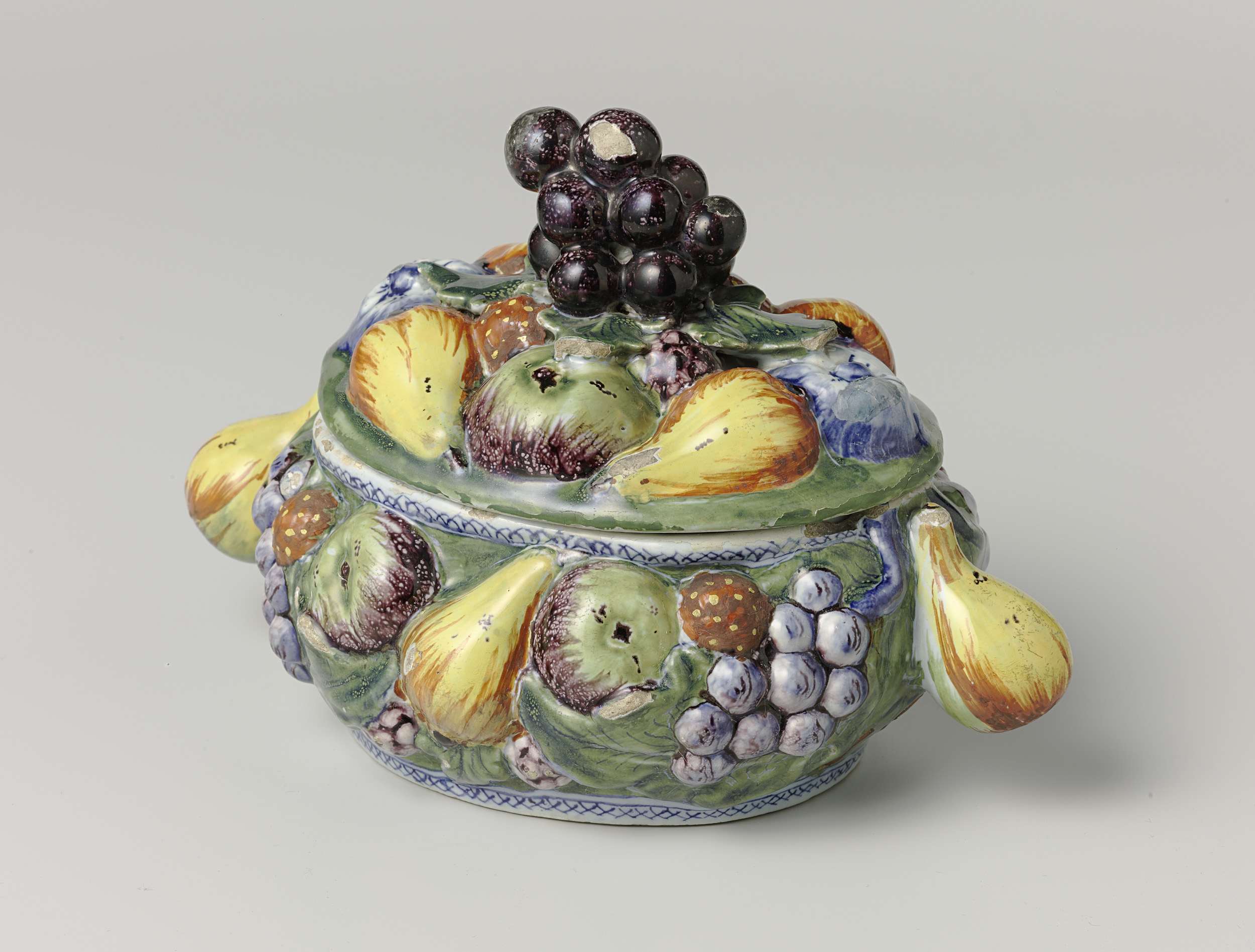 Deksel van botervloot van faience. De buitenzijde van deksel is versierd met gemodelleerde en veelkleurig beschilderde vruchten en bladeren. Gemerkt: I VD B. (Nederlands)