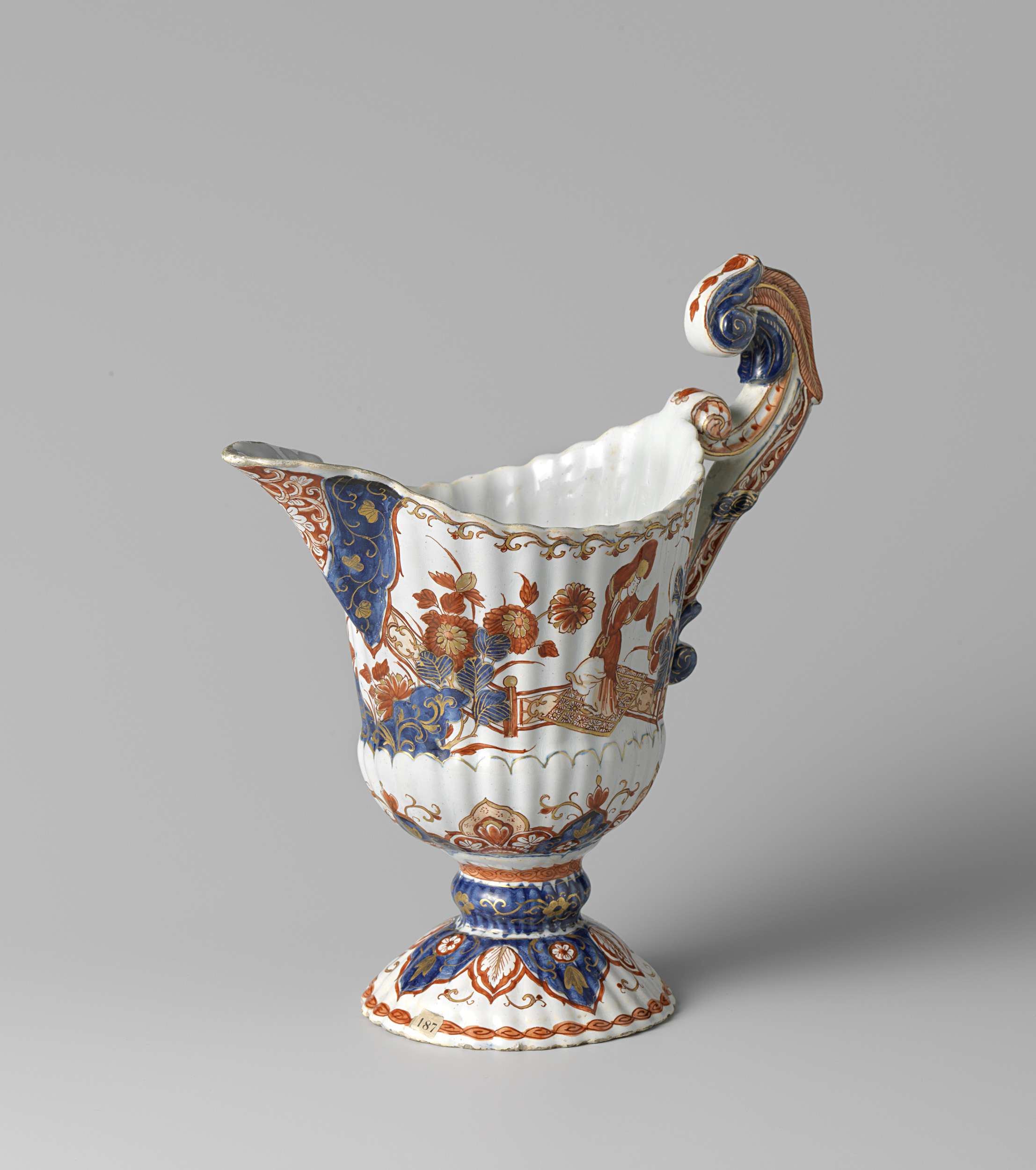 Kan van faïence. Veelkleurig beschilderd met figuren in een tuin en lambrequinrand. (Nederlands)