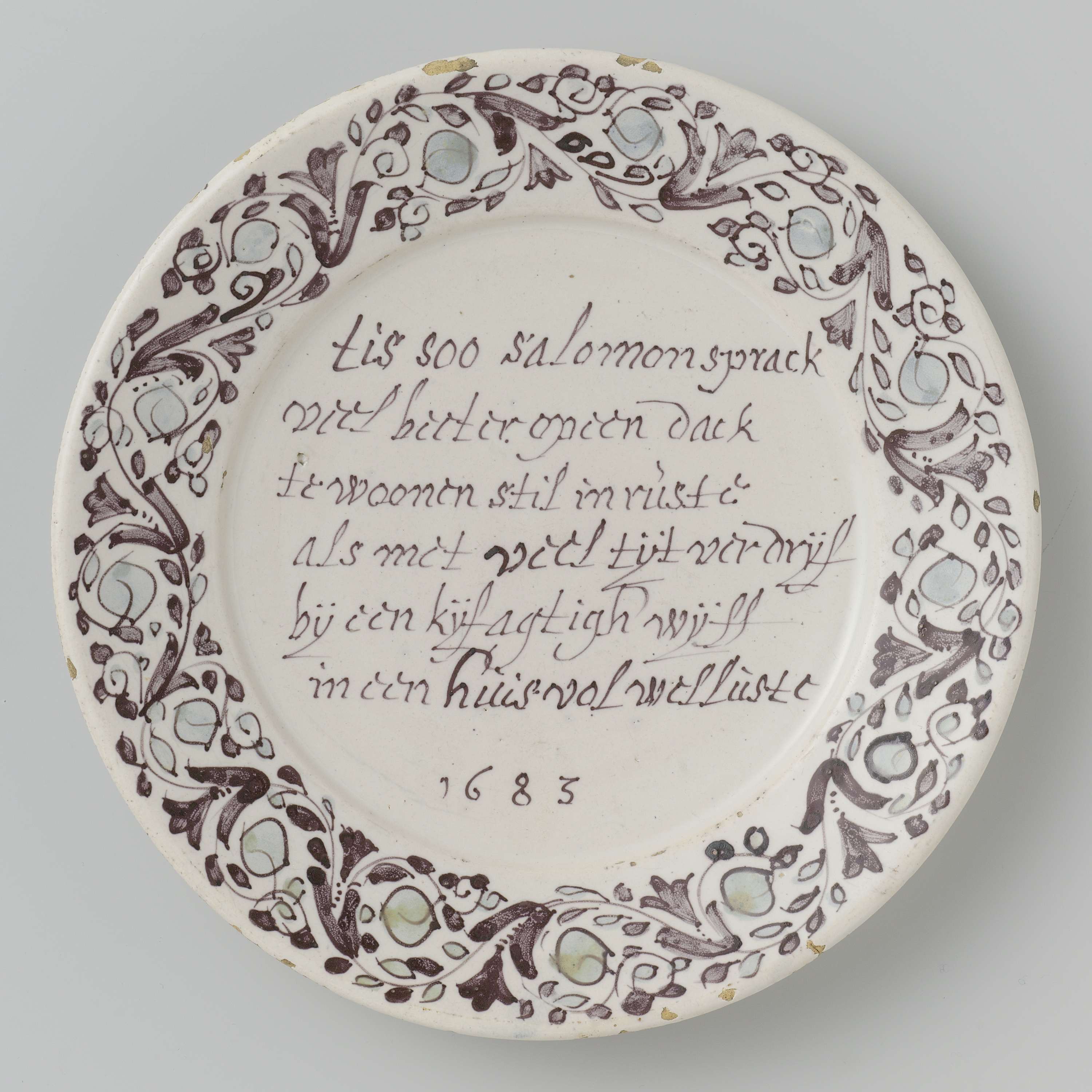 Bord van faience, veelkleurig beschilderd met de tekst: t is soo salomon sprack/ veel beter op een dack/ te woonen stil in ruste/ als met veel tijt verdrijf/ bij een kijfagtigh wijff/ in een huis vol welluste/ 1683. (Nederlands)