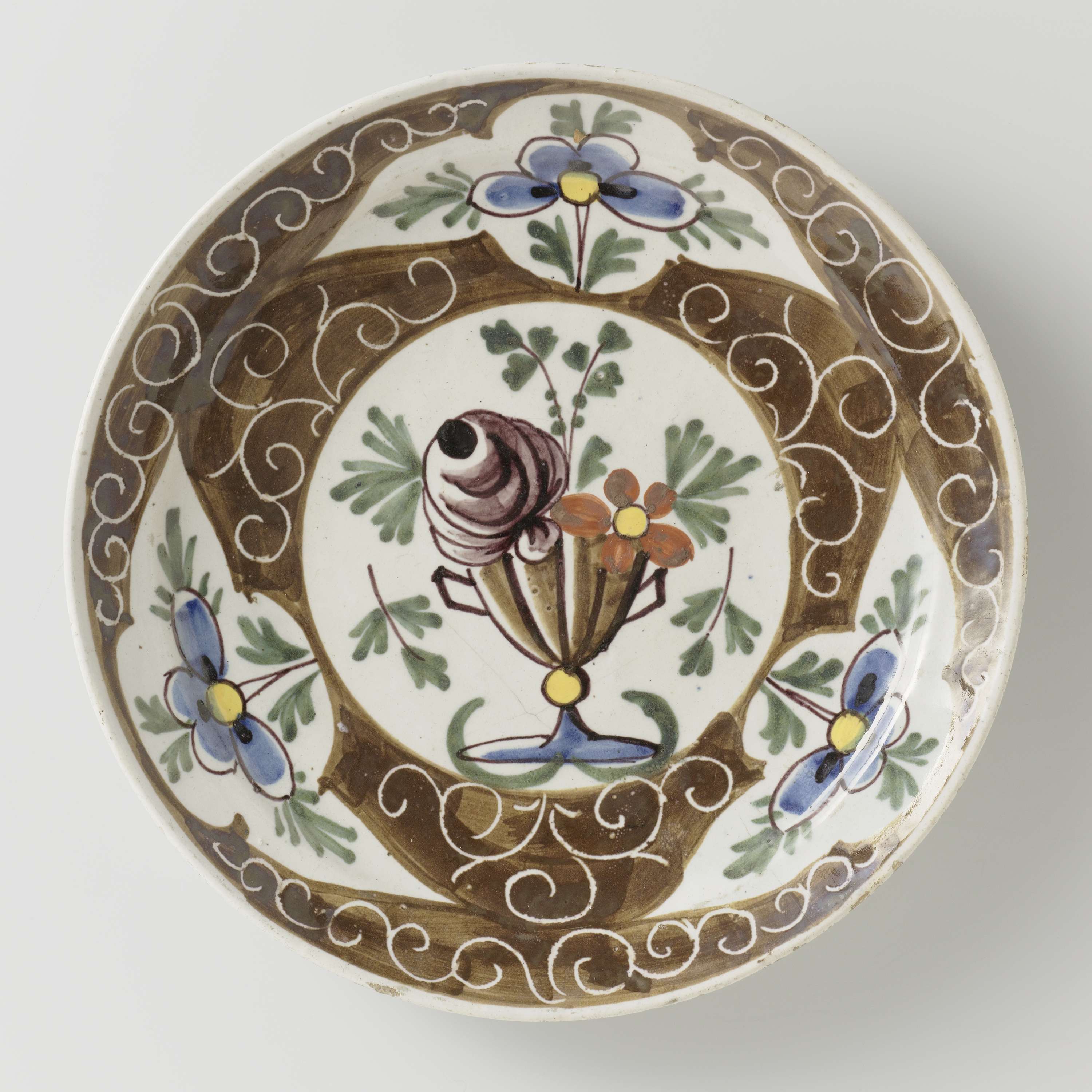 Bord van faience veelkleurig beschilderd met een vaas met bloemen en een gedecoreerde rand. (Nederlands)