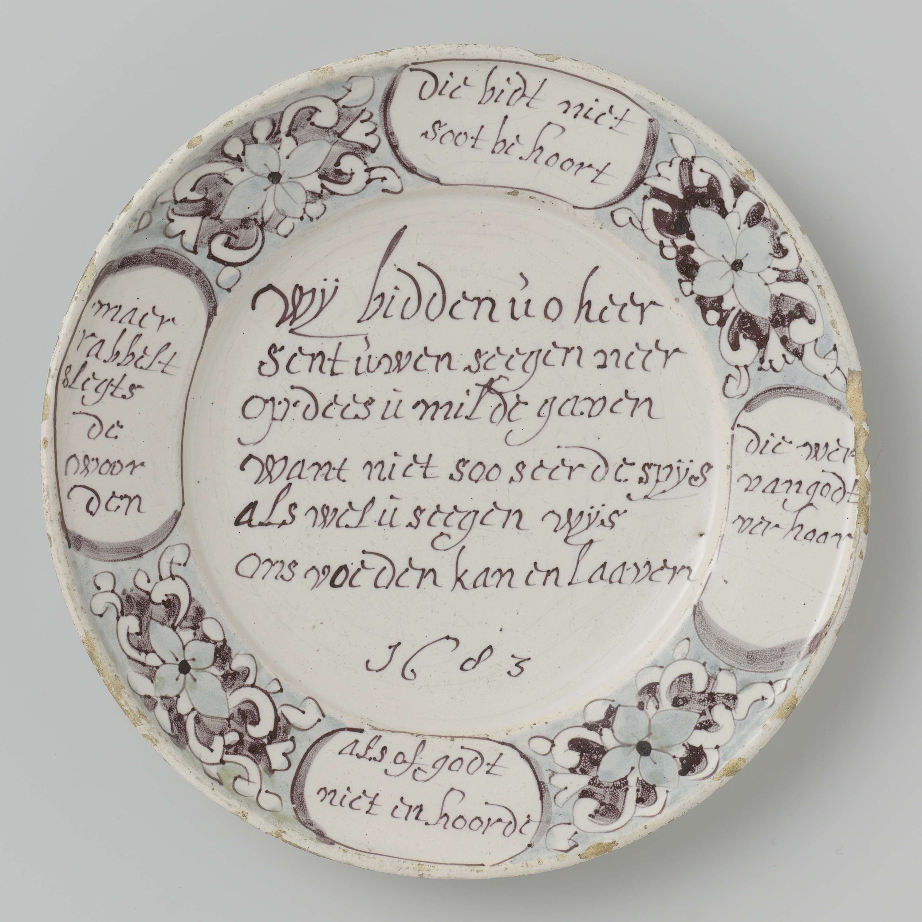 Bord van faience, veelkleurig beschilderd met de tekst: wij bidden u o heer/ Sent uwen seegen neer/ op dees u milde gaven/ want niet soo seer de spijs/ als wel u seegen wijs/ ons voeden kan en laaven/ 1683. Op de rand de tekst in vier cartouches: Die bidt niet/ soot behoort; Maar/ rabbelt/ slegts/ de/ woor/ den; die wer/ van godt/ verhoor; alsof godt/ niet en hoorde. (Nederlands)