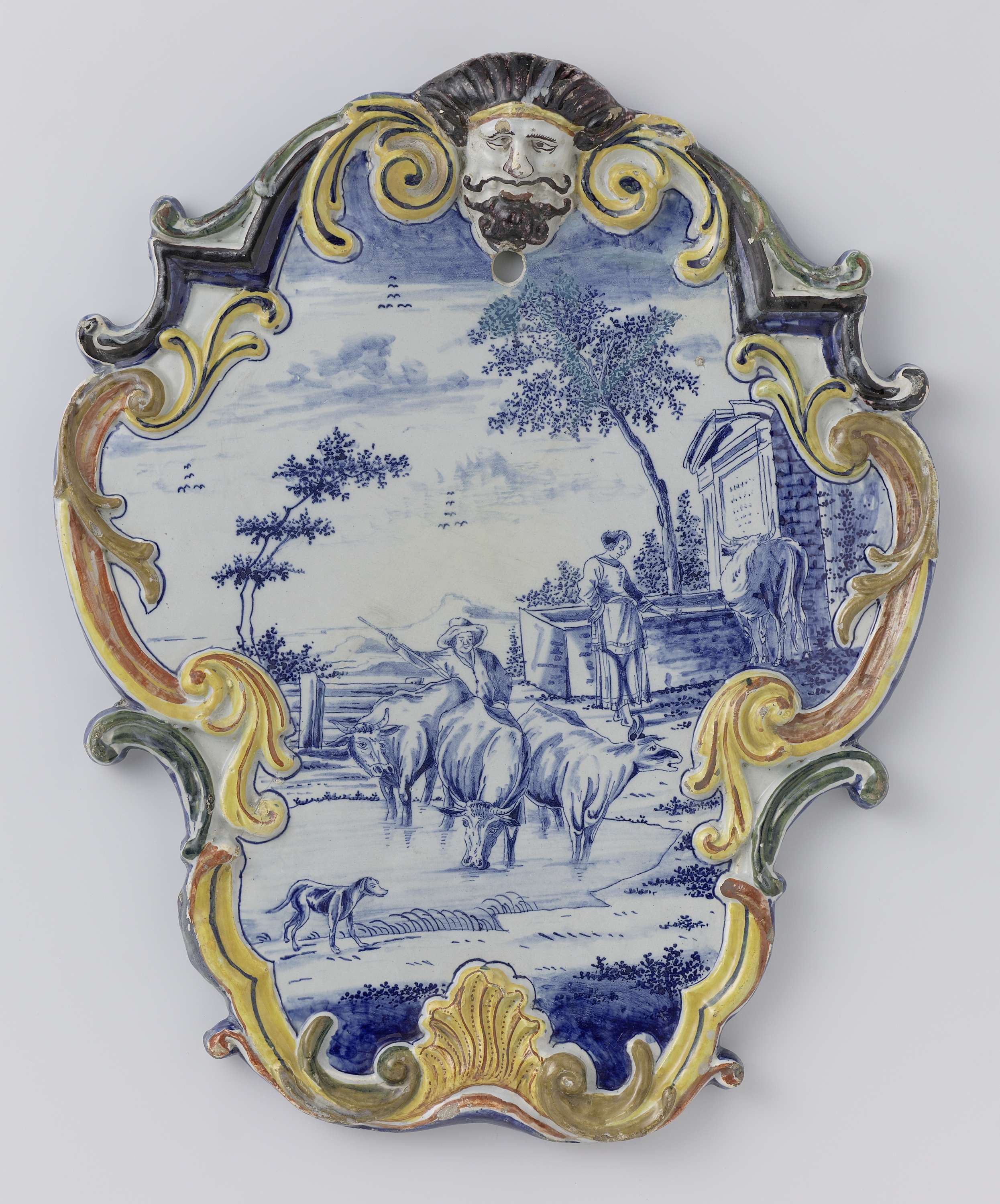 Plaat in de vorm van een cartouche met mascaron; beschilderde in blauw met een landschap met koeien