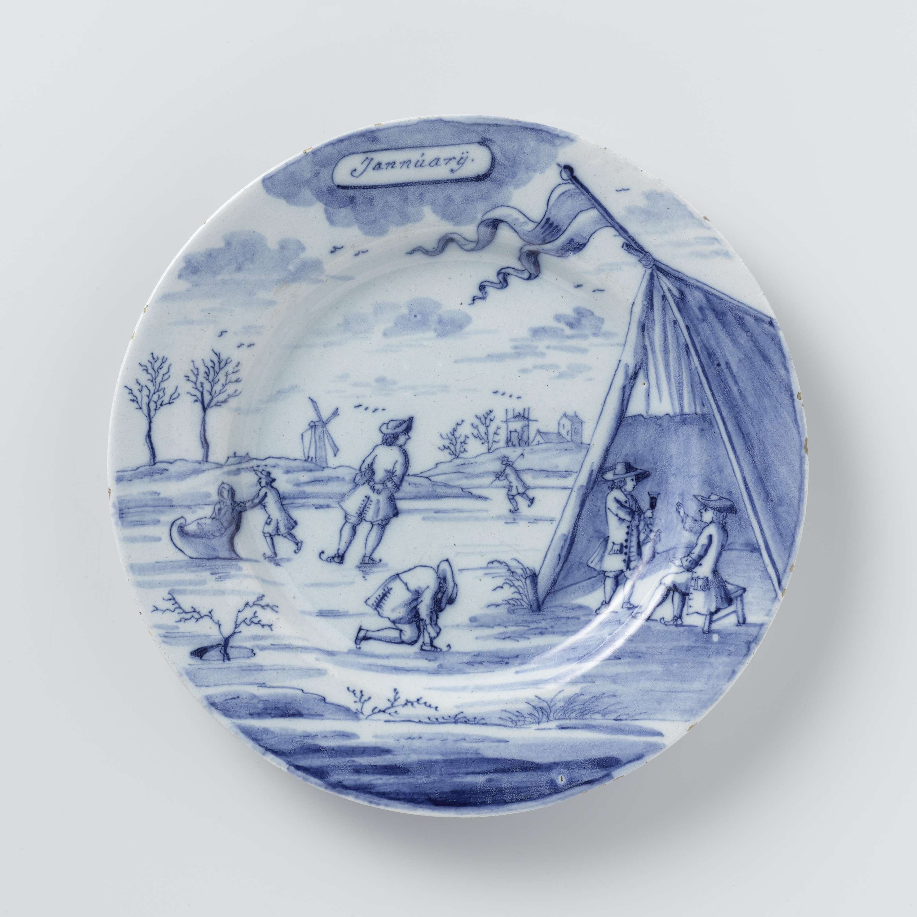 Bord van faience, uit de serie de 12 maanden. Voorstellende de maand januari. Afgebeeld is: het ijsvermaak, met de tekst: Jannuarij. (Nederlands)