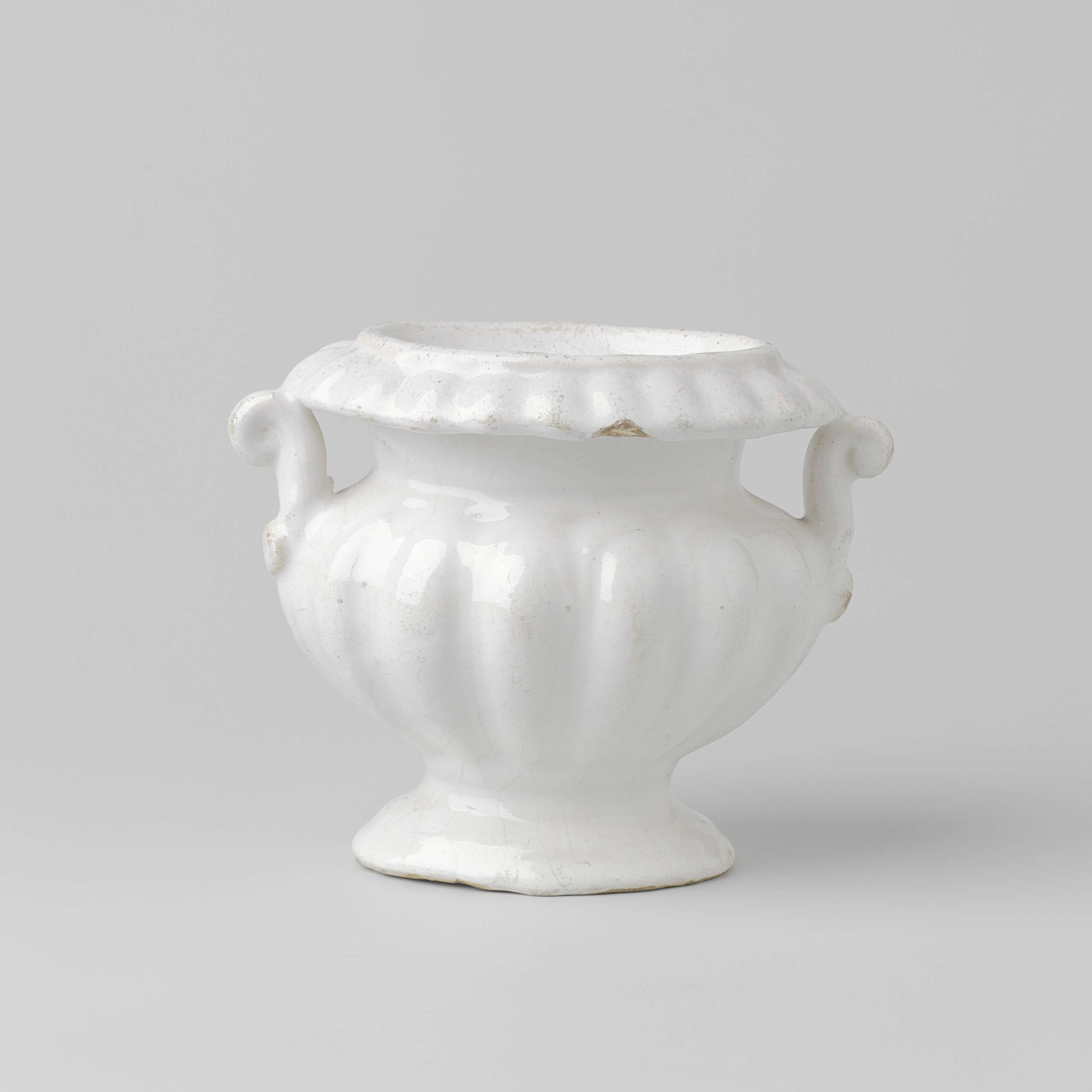 Breed canopisch zoutvat van ongedecoreerde faience, op een voet en met een naar beneden overkragende rand. De rand en de wand zijn gelobd en het vat heeft twee voluutvormige oren. (Nederlands)