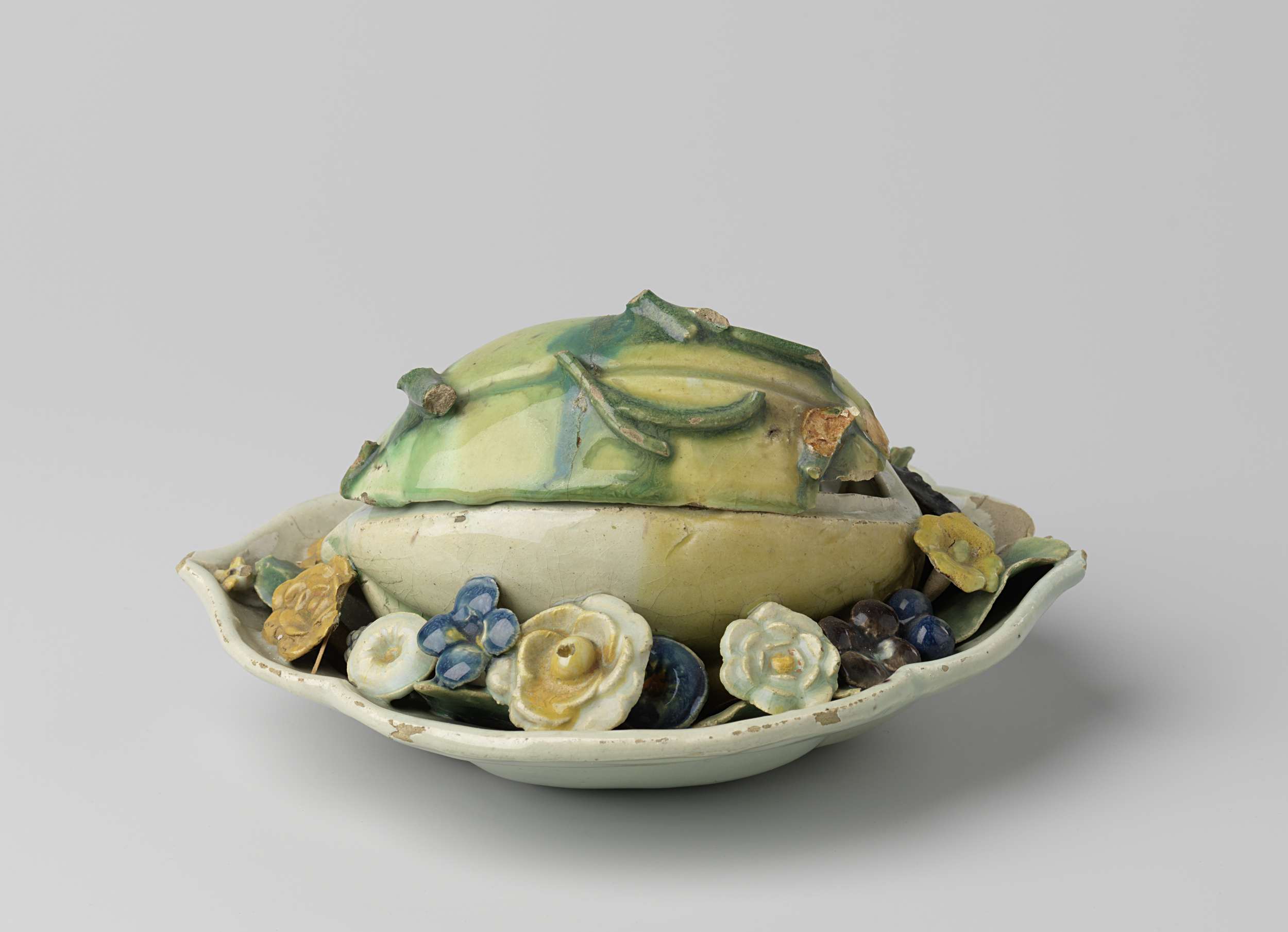 Botervloot van veelkleurig beschilderde faience, met een deksel. De botervloot heeft de vorm van een meloen. De botervloot is gemerkt en bij de botervloot hoort een identiek exemplaar met het invnr. BK-NM-5017. (Nederlands)