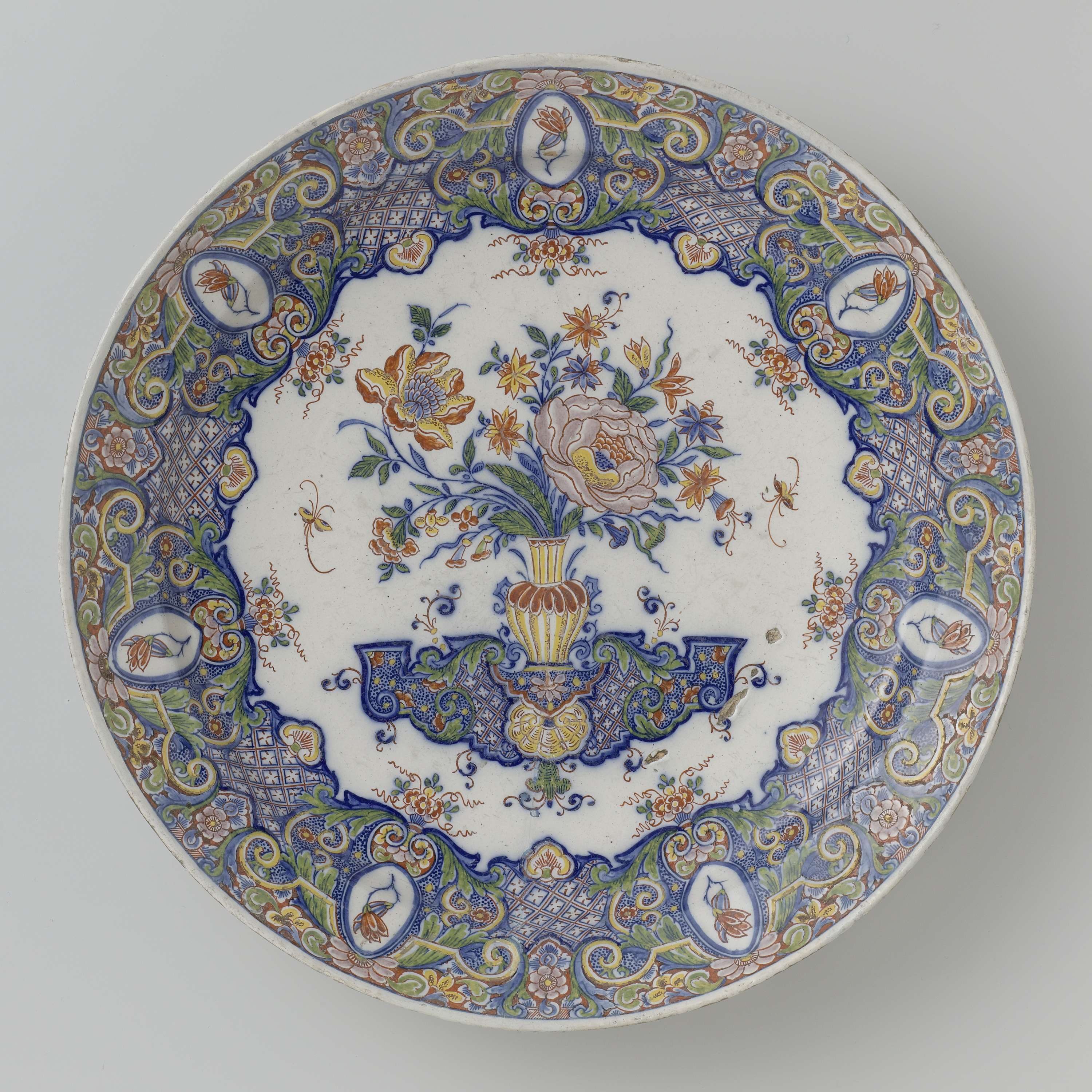 Schotel van faïence. Veelkleurig beschilderd met een bloemenvaas. Rand versierd met lambrequins. (Nederlands)