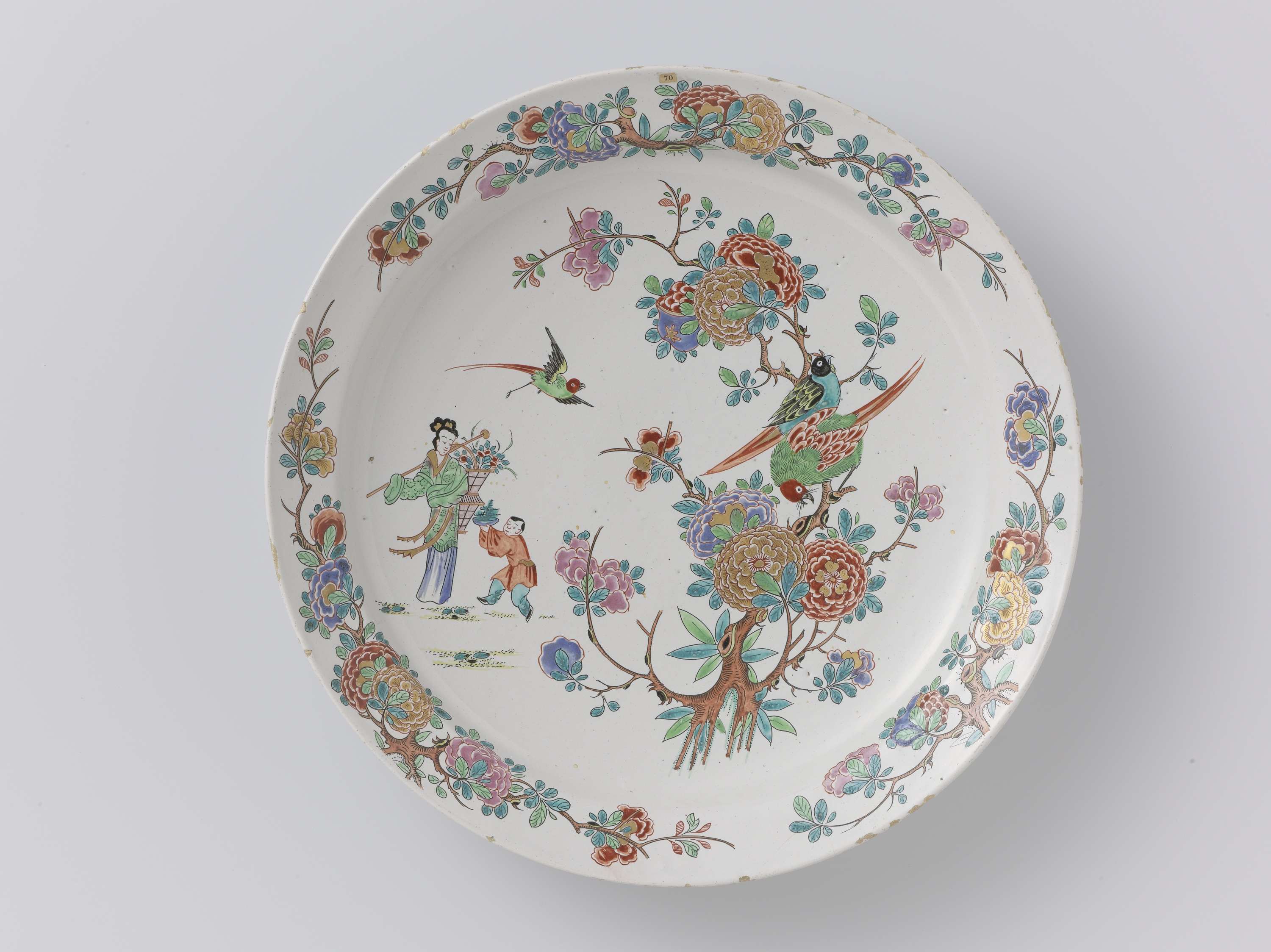 Schotel van aardewerk, polychroom beschilderd, met op het plat een Chinese vrouw met jongen, naast bloemtakken en vogels. Op de rand drie losse bloemtakken (Nederlands)
