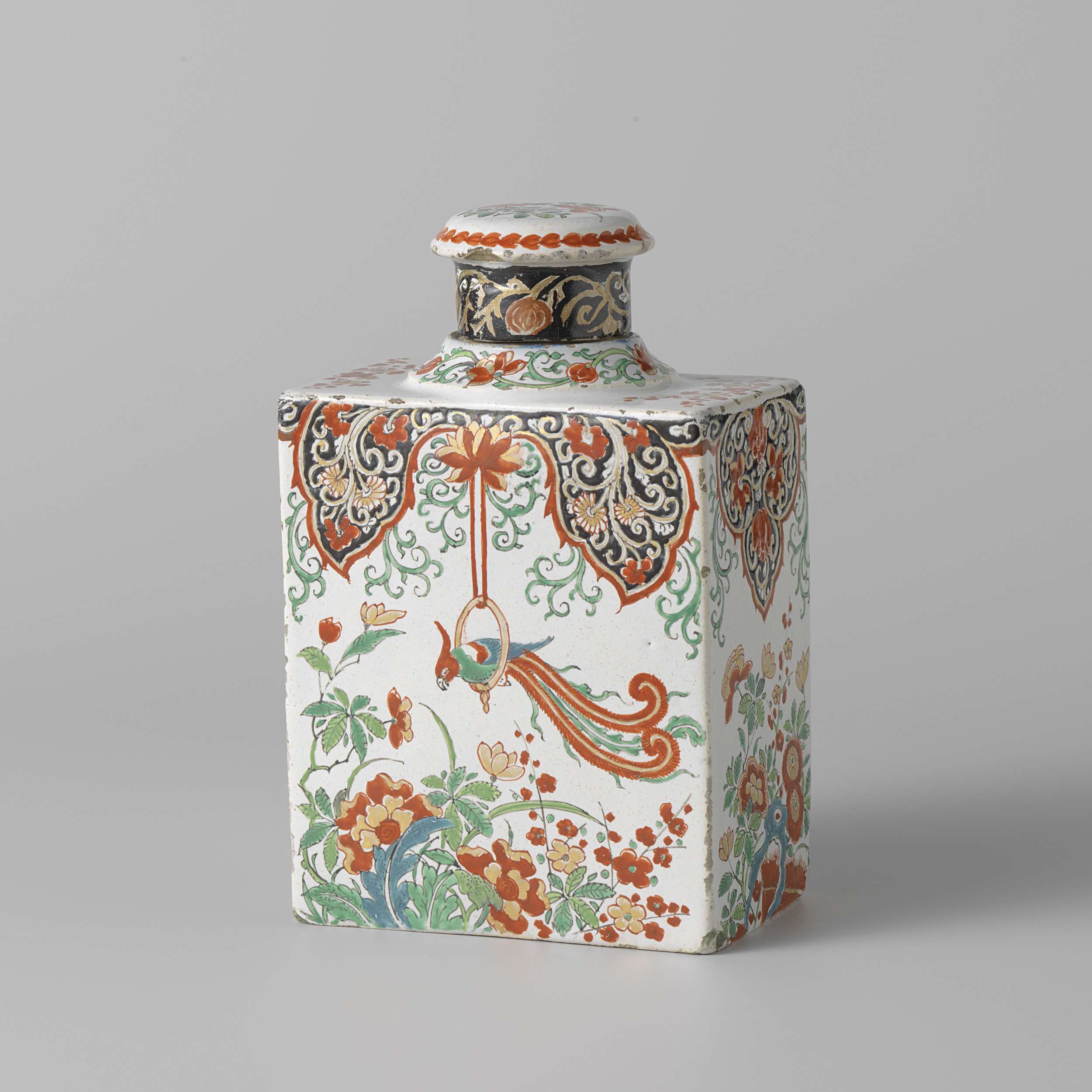 Rechthoekige theebus met deksel veelkleurig (blauw, rood, goud en zwart) beschilderd met een vogel in een ring, lambrequins en bloemtakken. Gemerkt in rood. (Nederlands)