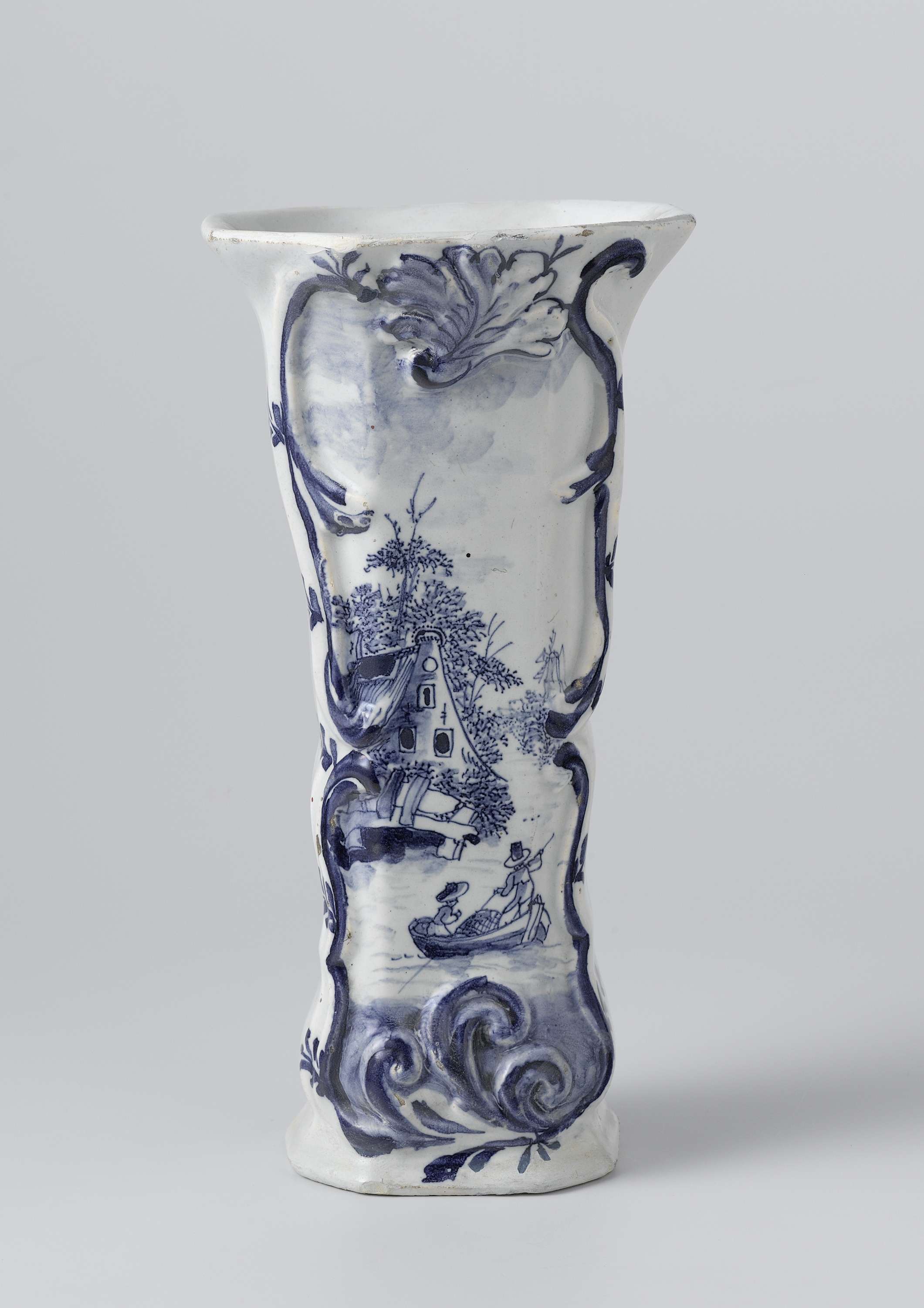 Vaas van faience. Blauw beschilderd met een Nederlands waterlandschap. De vaas is onderdeel van een kaststel. (Nederlands)