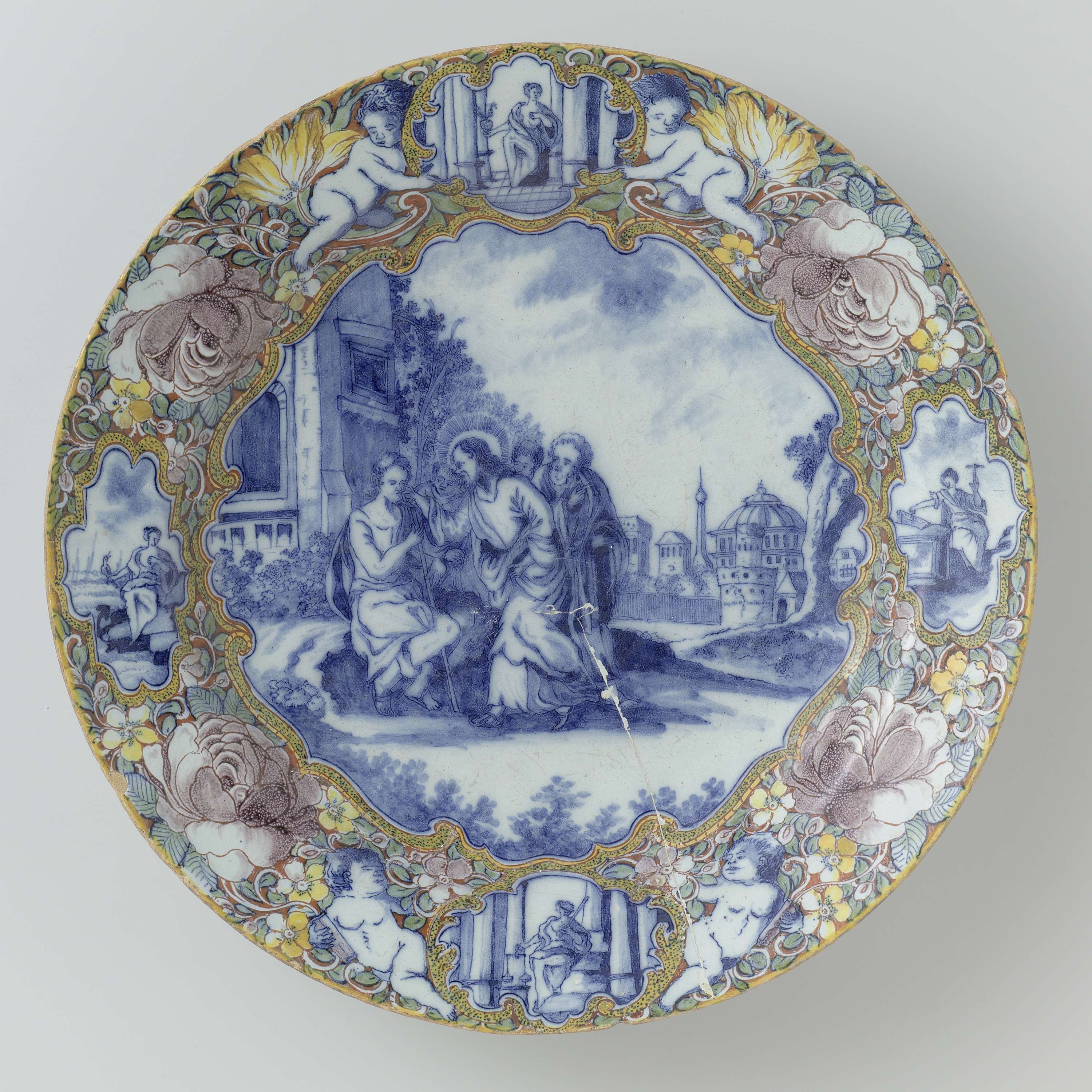 Schotel van faïence. Blauw beschilderd, met de voorstelling van de Genezing van de blinde. De brede rand is veelkleurig beschilderd, in vier cartouches zijn vier Christelijke deugden afgebeeld, vermoedelijk Caritas, Fides, Justitia en Spes (Nederlands)