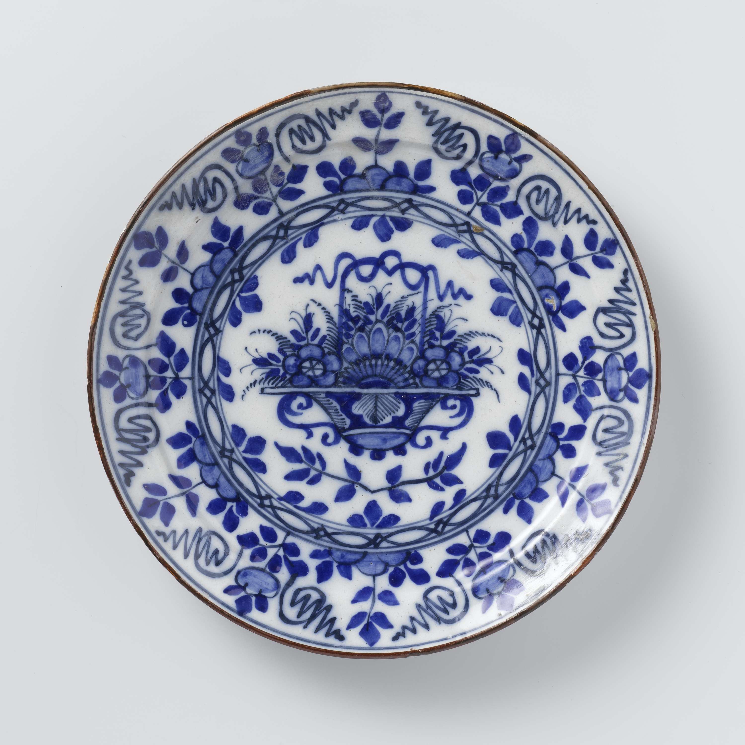 Bord van faience, met een bruine bies. Blauw beschilderd met een bloemenmand. (Nederlands)