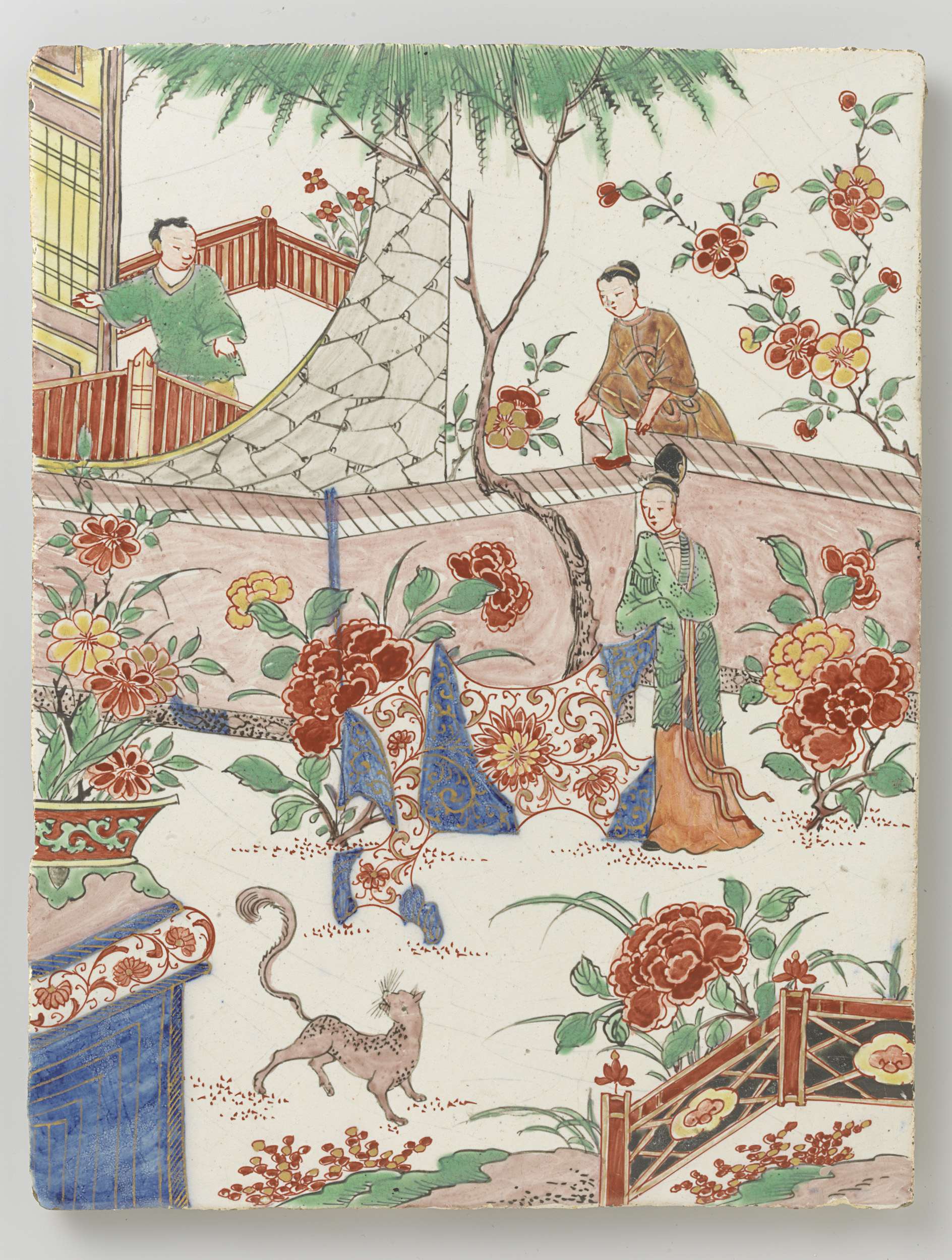 plaat van faience. Veelkleurig beschilderd met 3 chinese figuren in een tuin. (Nederlands)