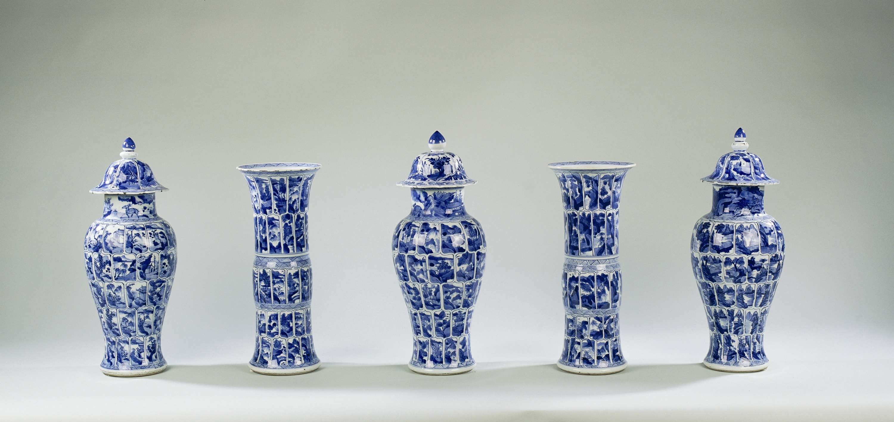 Balustervormige vaas, met spreidende voet, wijde hals en gewelfde deksel met overkragende rand en knop. Gedecoreerd in onderglazuur blauw met vijf horizontale banden van panelen in de vorm van een lotusbloemblad; beschilderd met rivierscènes met rotsen, bomen en brug of paviljoen. Vaas is onderdeel van een vijfdelig kaststel. (Nederlands)
