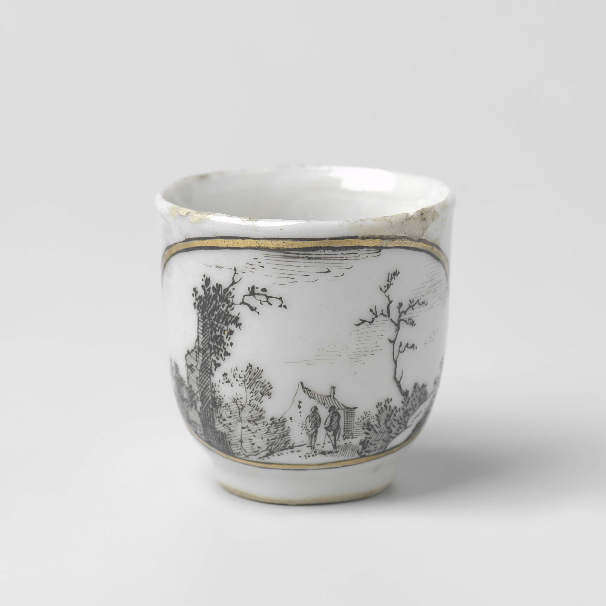 Oorkop van porselein beschilderd op het glazuur in zwart en goud. Op de buitenwand een Europees landschap met twee personen, een gebouw en bomen in een ovaal medaillon. Een chip in de rand en rand deels gerestaureerd. In Europa gedecoreerd in encre de Chine. (Nederlands)
