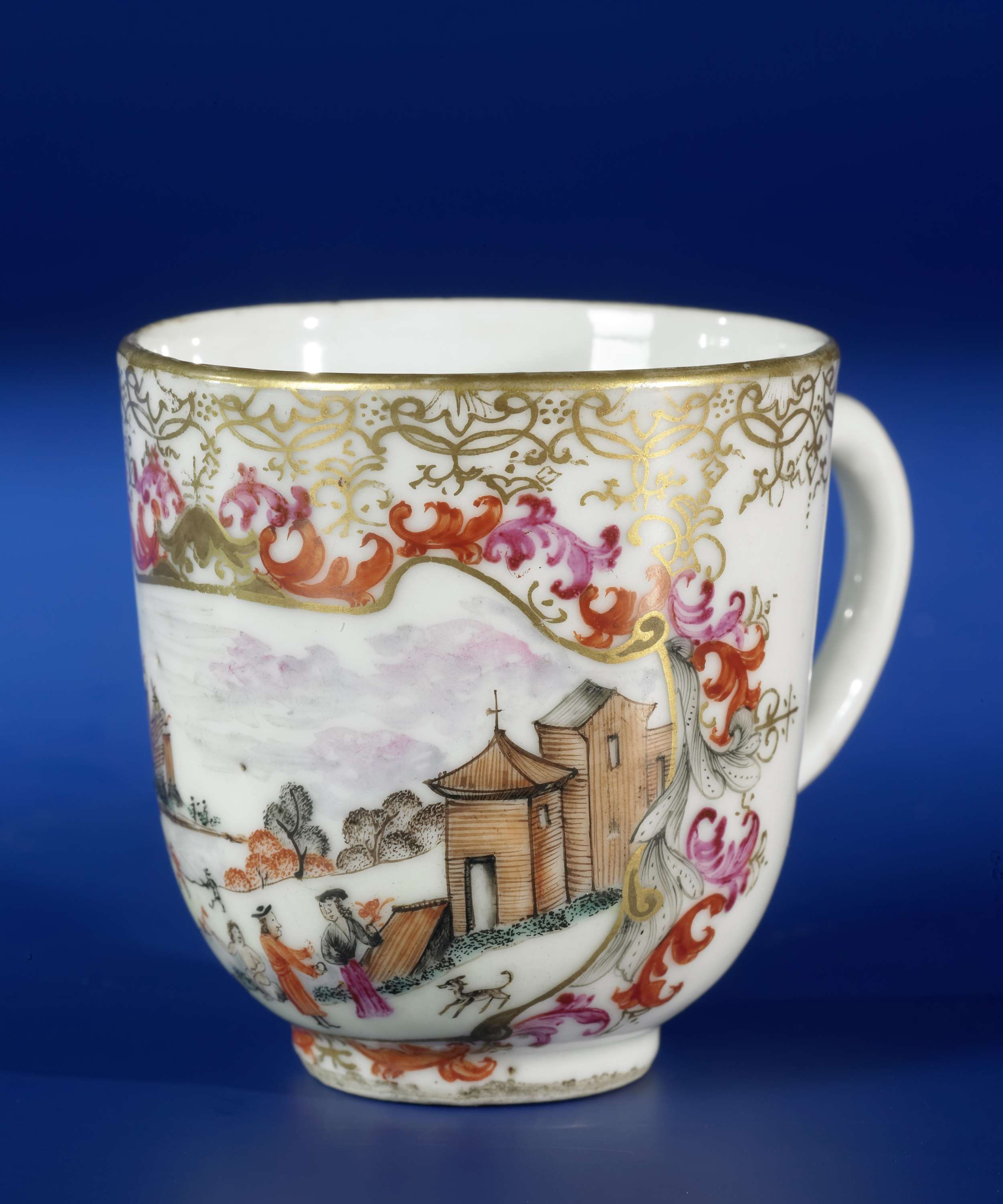 Oorkop van porselein, beschilderd op het glazuur in blauw, rood, roze, groen, paars, zwart en goud. Op de buitenzijde van de kop een cartouche met bladranken met daarin een Europees rivierlandschap met verschillende personen, een kerk en op de achtergrond enkele schepen; de buitenrand met ranken in Meissen-stijl. Europese voorstelling in emailkleuren. (Nederlands)