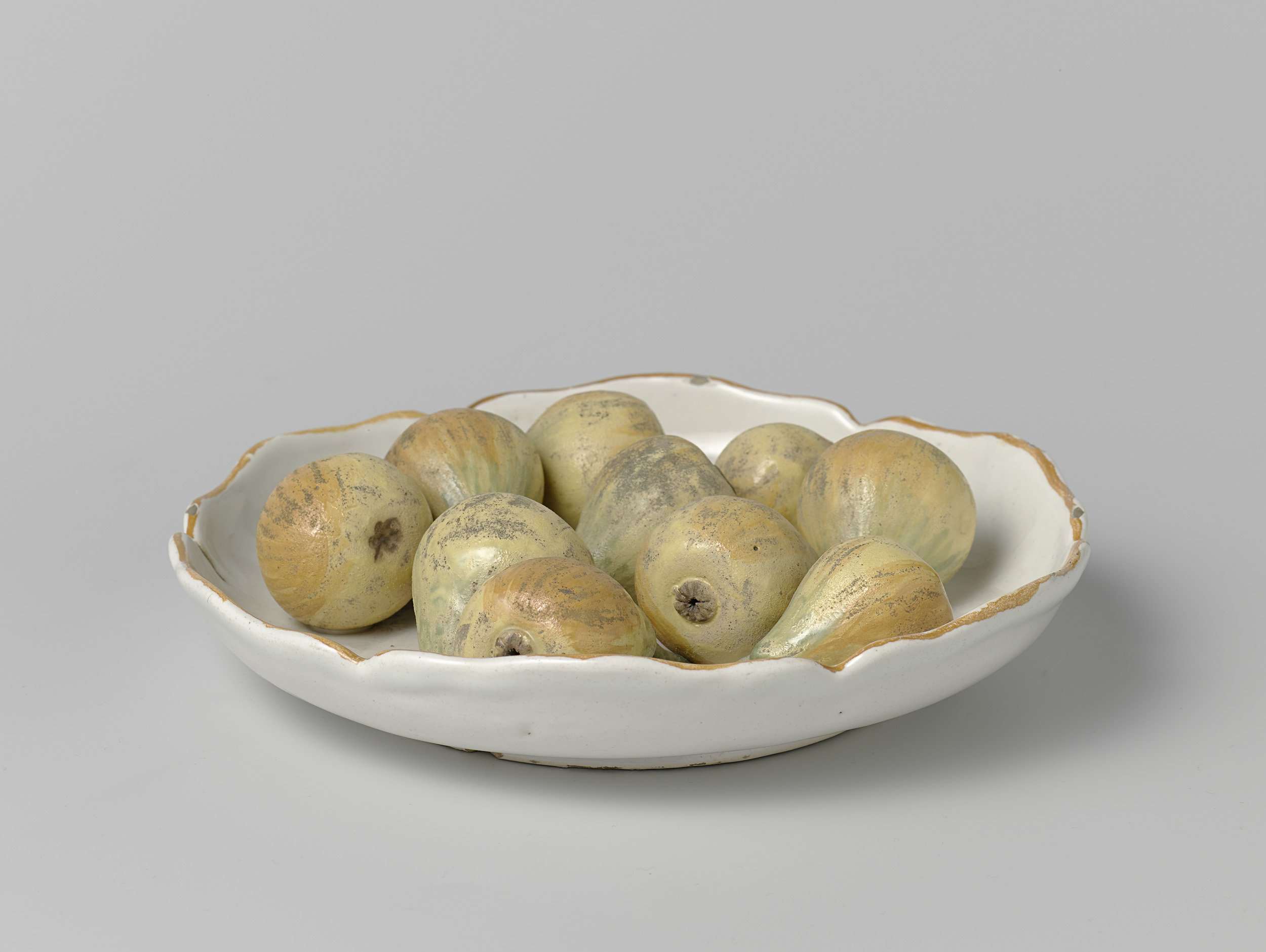 Ronde, witte schotel met peren, van veelkleurig beschilderde faience. De schotel heeft een geschulpte rand en op de schotel zijn tien peren bevestigd. (Nederlands)