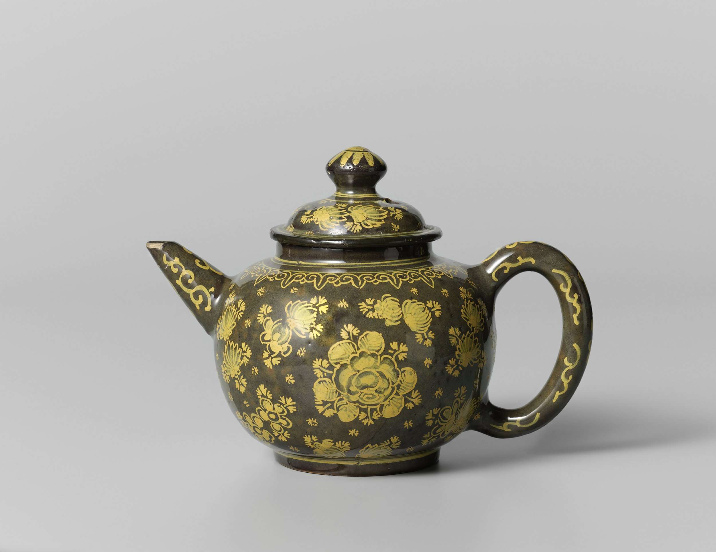 Theepot, beschilderd met gele bloemen op een bruingroene fond (Q27906)