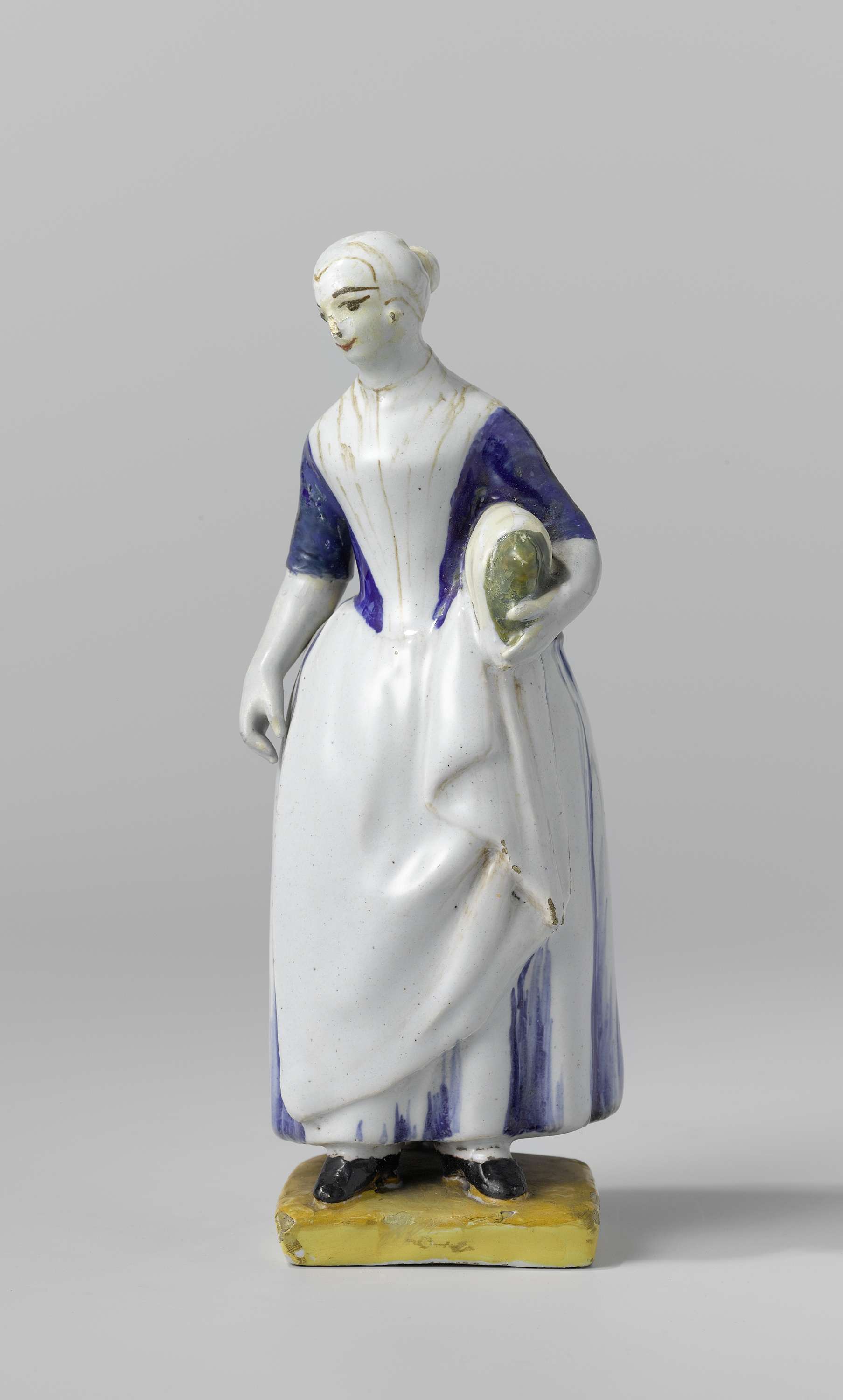 Vrouwenfiguur van faience, veelkleurig beschilderd in de glazuur. Op een rechthoekig, geel voetstuk staat een vrouw met zwarte schoenen en een witte rok, waarvan de schaduw van de plooien met blauw zijn aangegeven. Over de rok wordt een blauw jak gedragen, waarvan een deel bedekt wordt door een witte puntdoek. De rechterhand houdt een slip van de witte boezelaar, terwijl onder dezelfde arm een groen kussen gedragen wordt. Onder de nauw aansluitende muts, die door bruine lijnen wordt aangegeven is de haarwrong zichtbaar. (Nederlands)