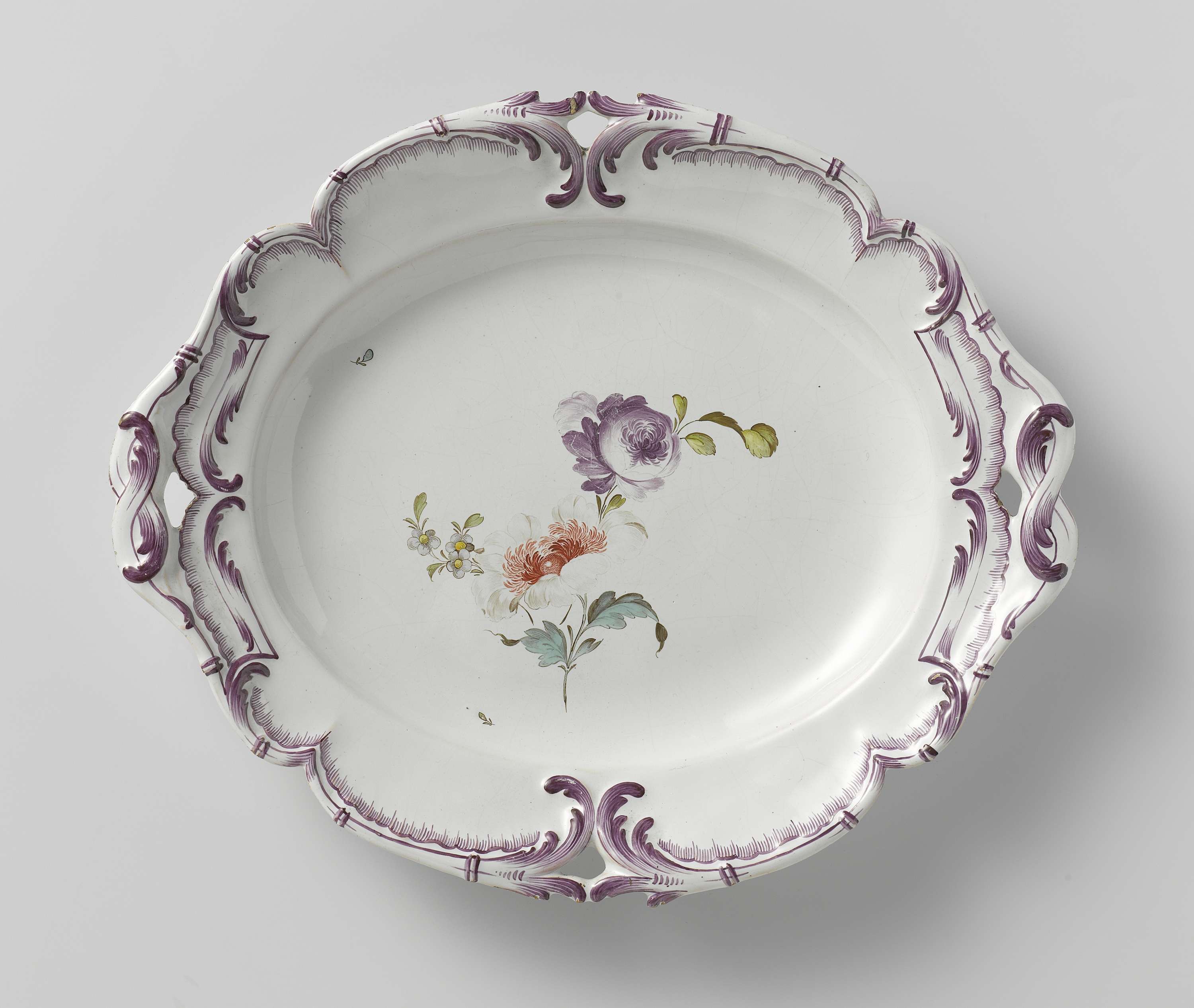 Schaal met een veelkleurig beschilderde bloemtak op het plat. Langs de rand rocaille ornament in relief. Gemerkt met een haan in paars. (Nederlands)