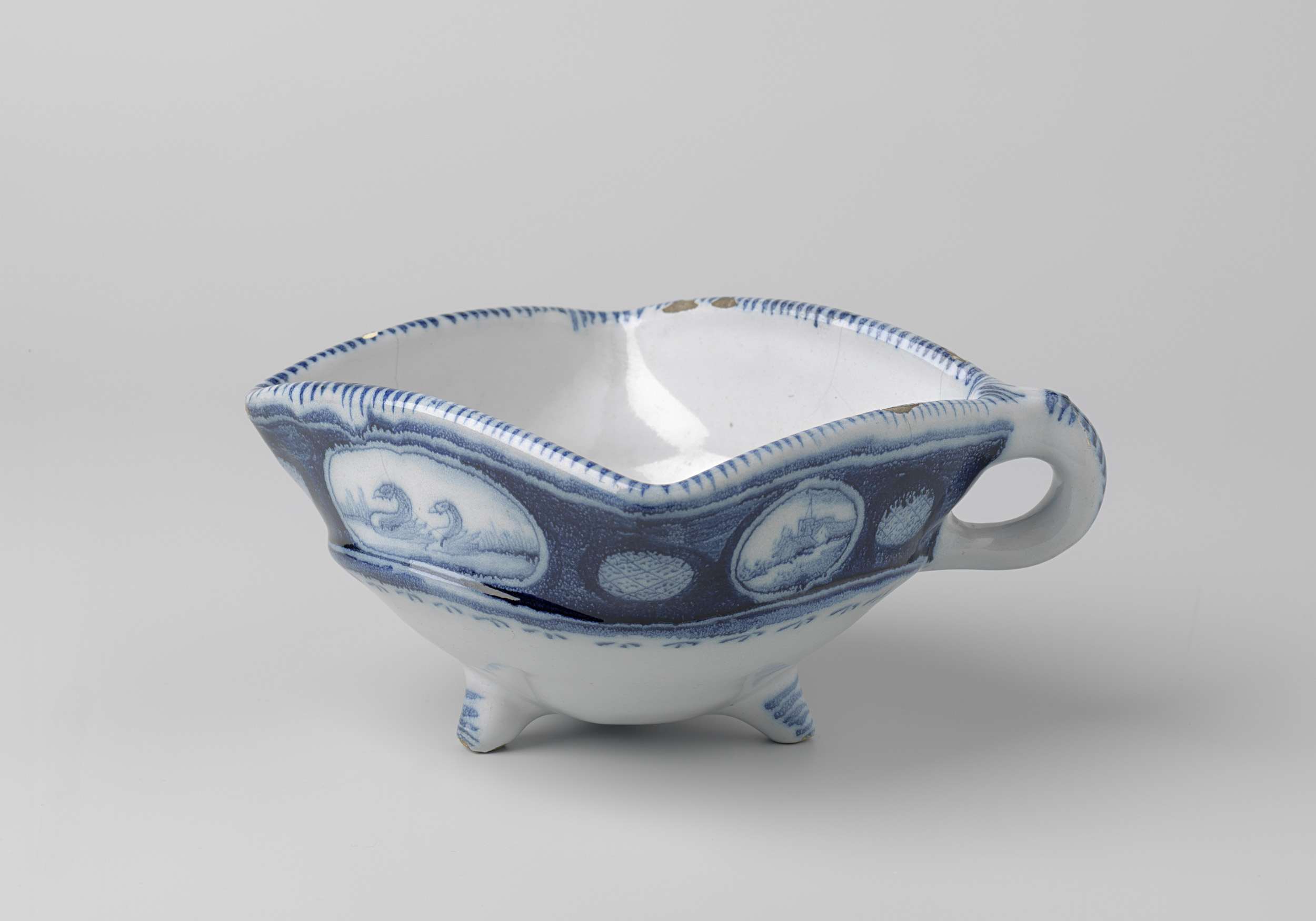 Test van faïence, in blauw beschilderd met medaillons met landschappen waarvan twee een waterlandschap. (Nederlands)
