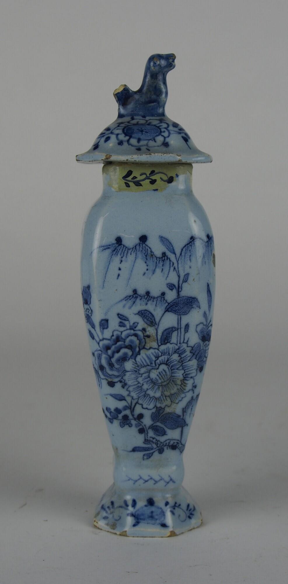 Deze vaas maakt deel uit van een kaststel met 3 dekselvazen en 1 bekervaas. De vazen zijn gedecoreerd met een bloemmotief. Deksel zit vastgelijmd. Er mist een stukje van de sierknop. (Nederlands)
