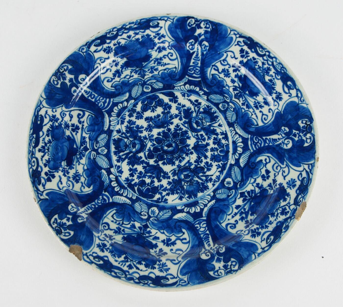 Rond bord met op het plat rozentakken in cirkel versierd met halve rozetten. Op de wand en rand, bloemornament met krulornament aan weerszijden. Schade aan de randen. (Nederlands)