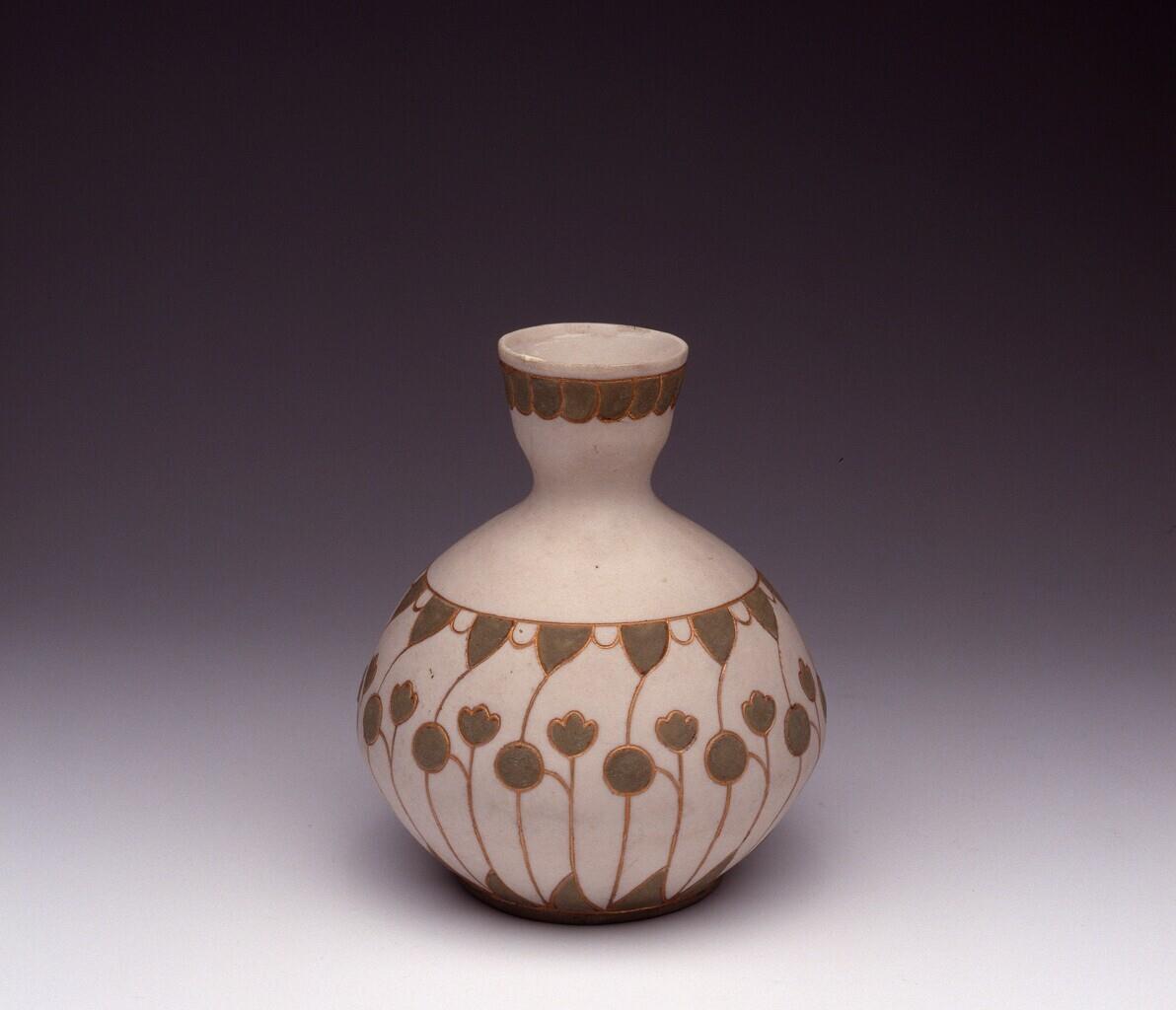 Vaas met een ingegrifte symmetrische decoratie bestaande uit gestileerde florale motieven van met goud ingekleurde lijnen en groen porseleinslib. De vaas is aan de binnenkant geglazuurd. (Nederlands)