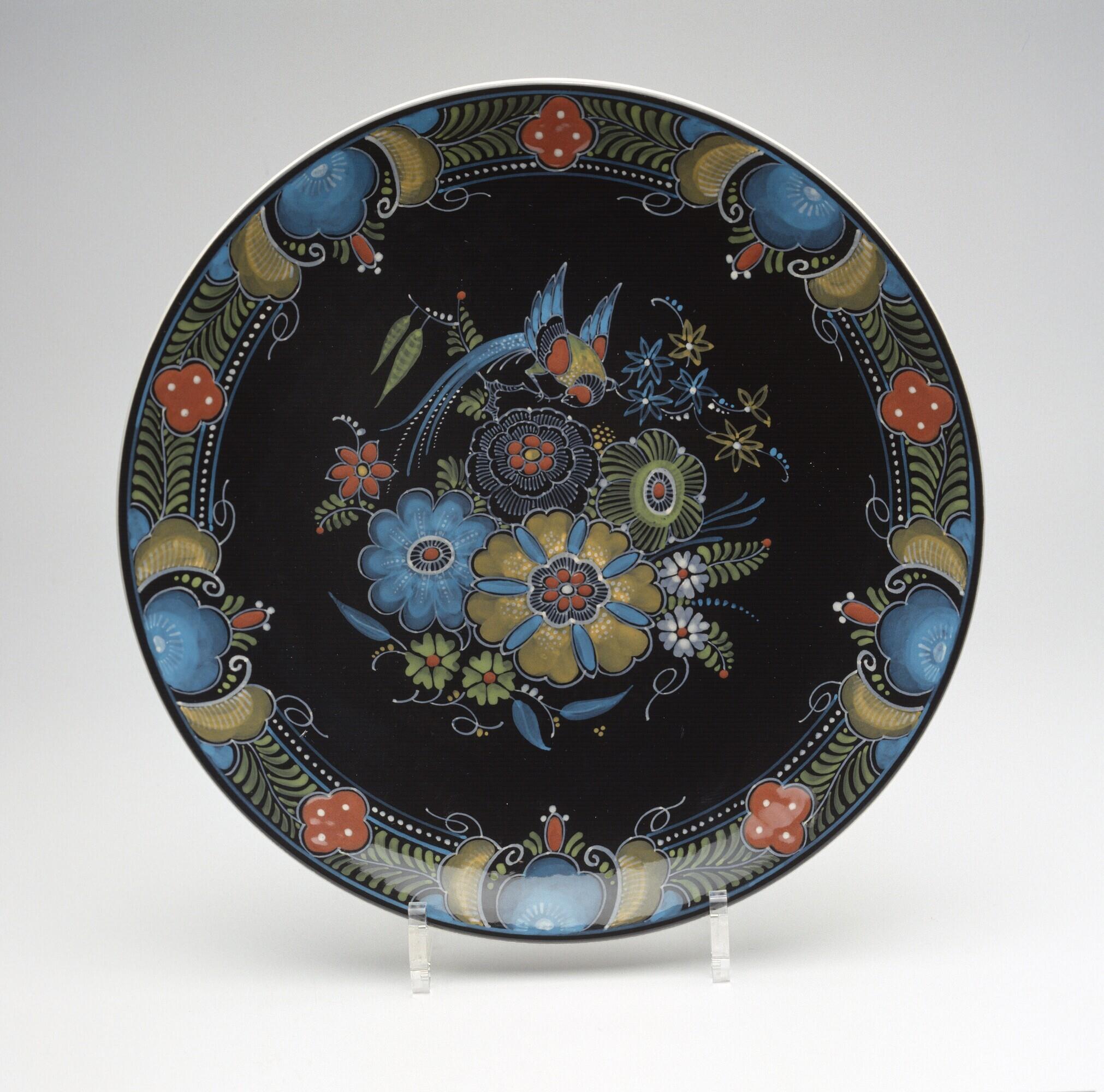 Een ronde schotel, zogenaamd Zwart Delfts met floraal decor op zwart fond, op standring. Decoratie aan de rand met bloemmotieven en in het midden bloemmotieven en een vogel op een tak. (Nederlands)