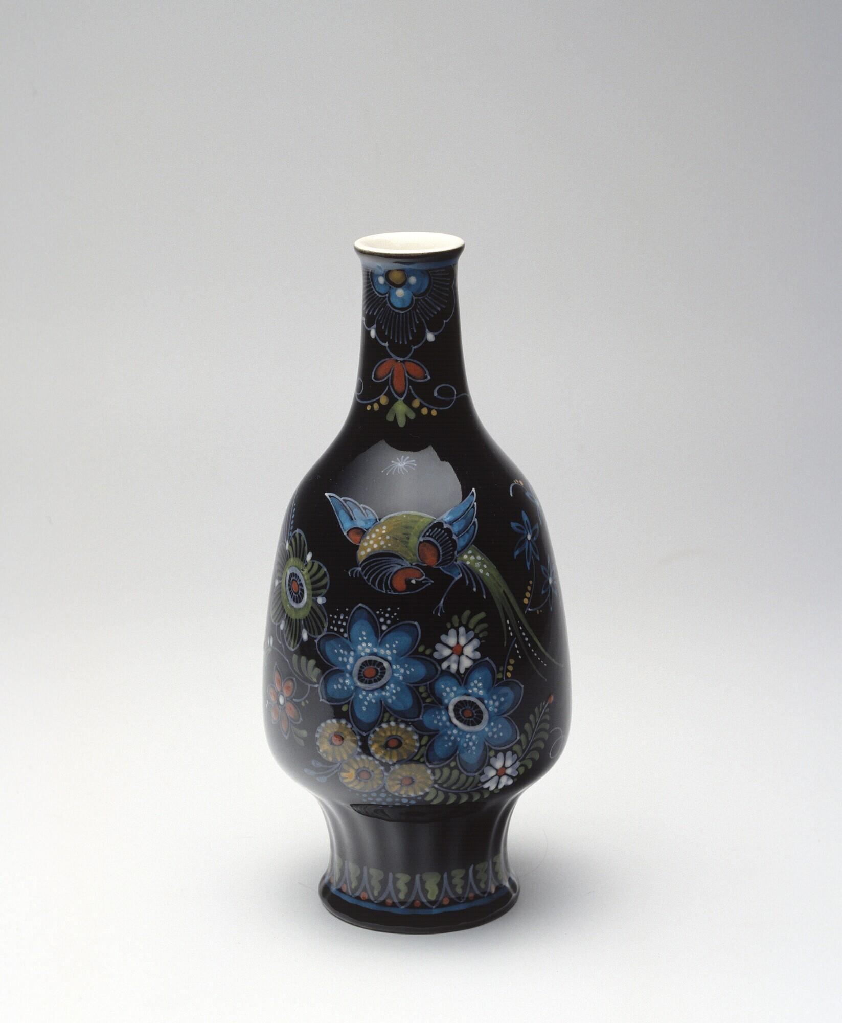 Een flesvormige vaas zogenaamd Zwart Delfts met floraal decor op zwart fond. Decoratie aan de voorzijde met bloemmotieven en een vogel. Op de achterkant, hals en voet bloemmotieven. (Nederlands)