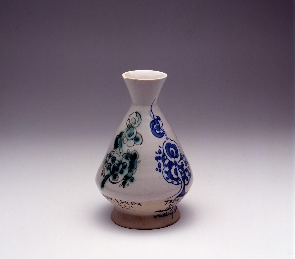 Vaasje, deels geglazuurd, met verschillende decoratiemotieven of 'oefendecors', met opschrift van technische gegevens (Nederlands)