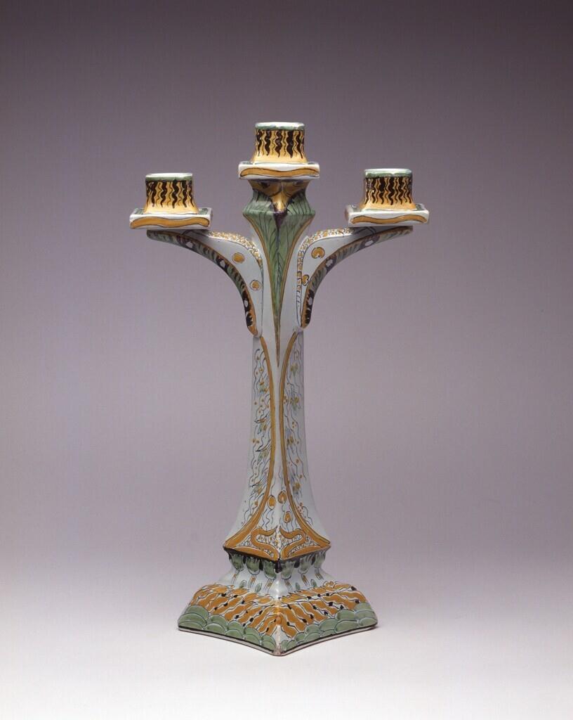 Vierzijdige kandelaber met met twee armen en drie vierkante kaarshouders, staande op een een uilopende voet. Lineaire, florale decoratie in groen, geel en zwart. (Nederlands)