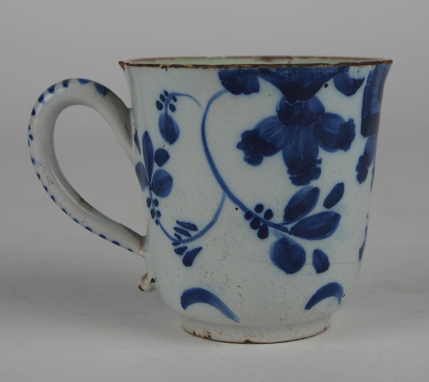 Kopje met een beschildering van een blauwe bloem en een bruine lijn langs de rand. Oor is met dwarsstreepjes versierd. (Nederlands)