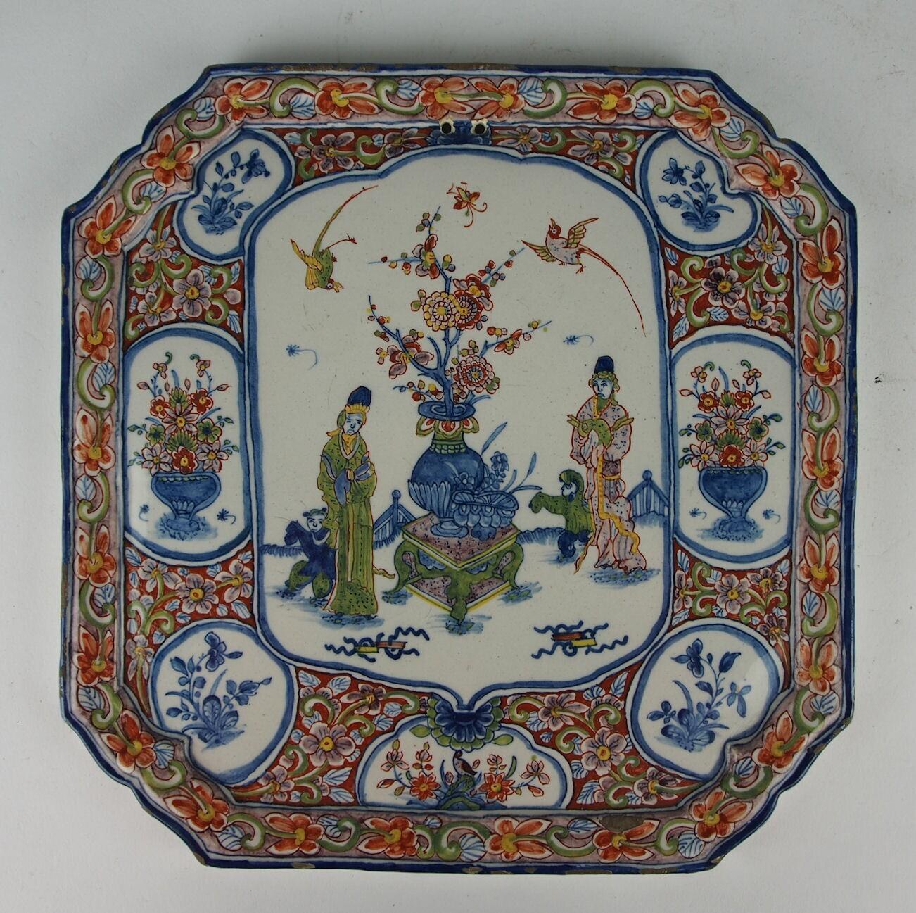 Plaque versierd met twee Chinezen en een bloemenvaas in een tuin en een zeer fijn getekende rode rand. Schade aan de randen. (Nederlands)