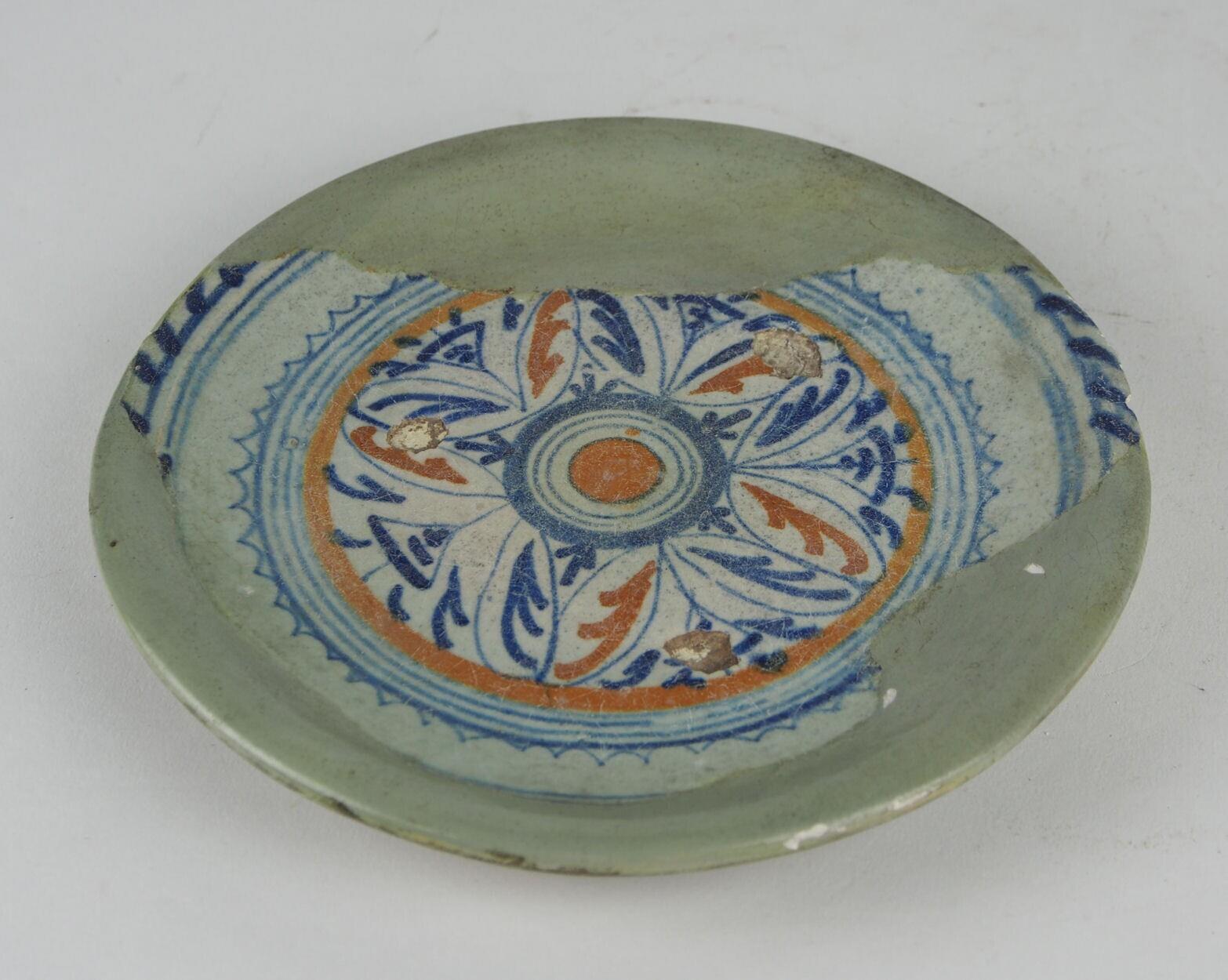 Rond bord met op het plat cirkels omgeven door bladornament. Op de rand bladstreepjes. Is gerestaureerd. (Nederlands)
