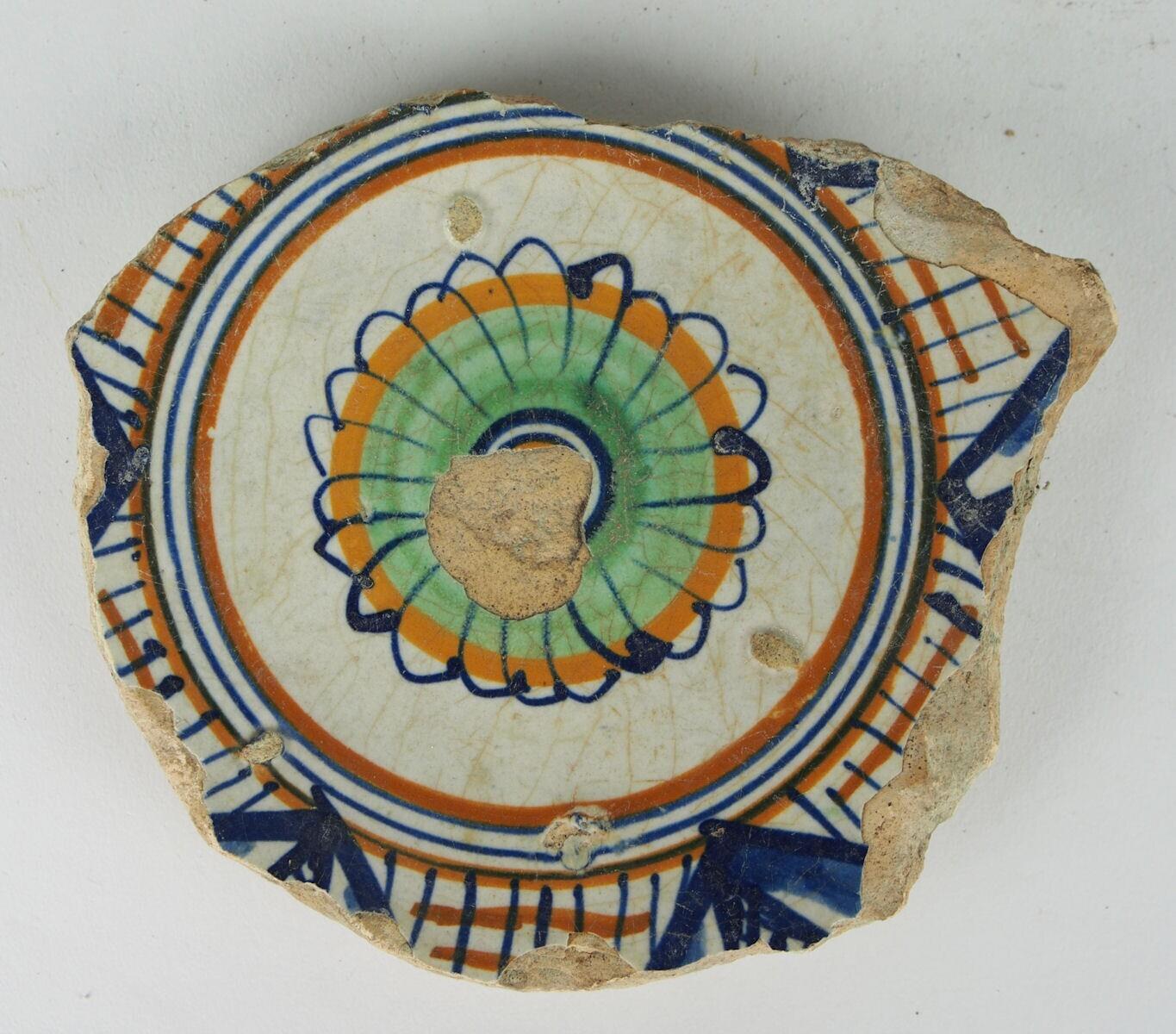 Majolica fragment met op de buitenwand loodglazuur. Plat versierd met een rozet, omgeven door een ornamentale band. Gele scherf. Er mist glazuur in het midden. (Nederlands)