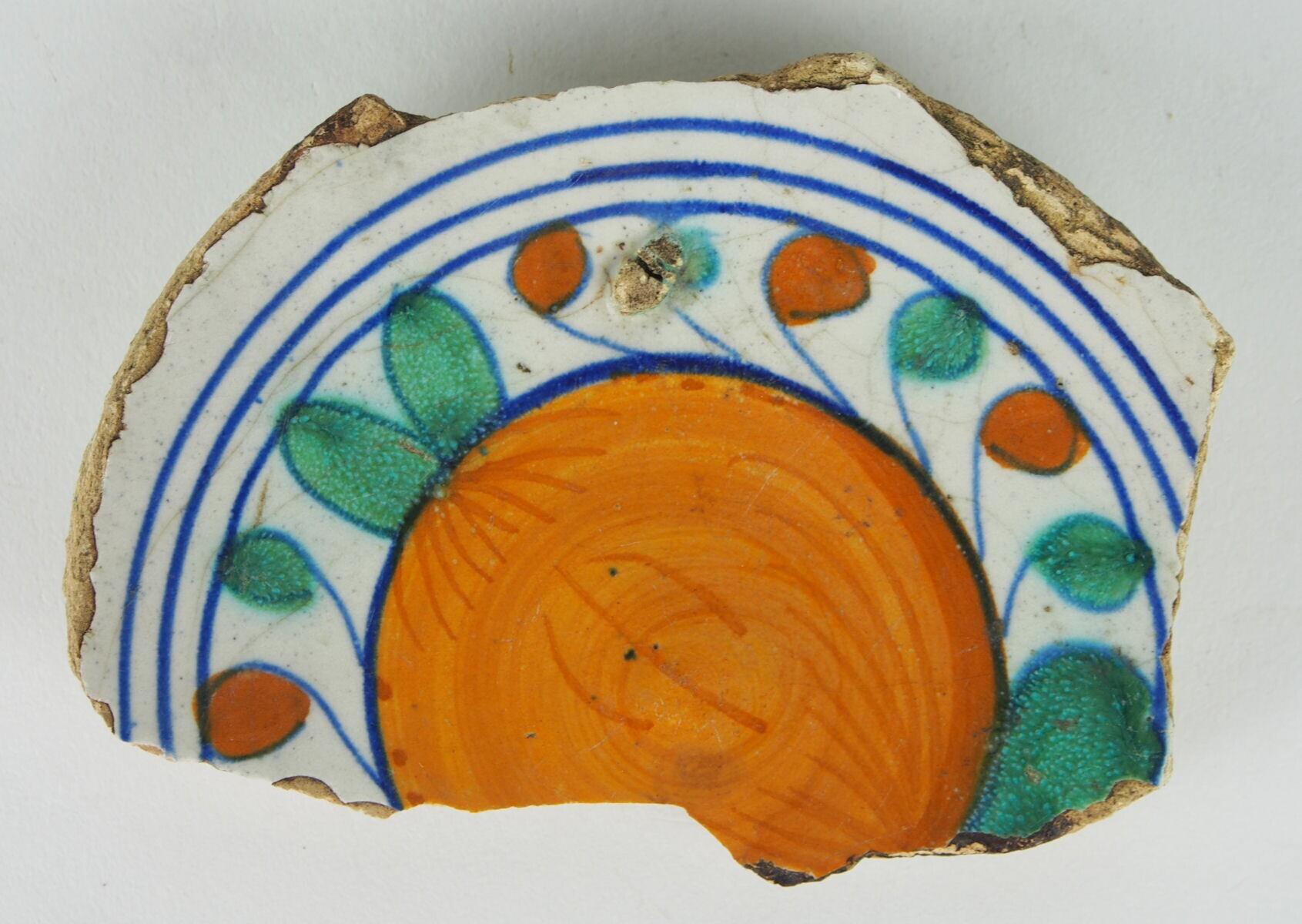 Majolica fragment met op de buitenwand grijs loodglazuur. Polychromie in blauw, groen en oranje van een oranjeappel. Grijs scherf. (Nederlands)