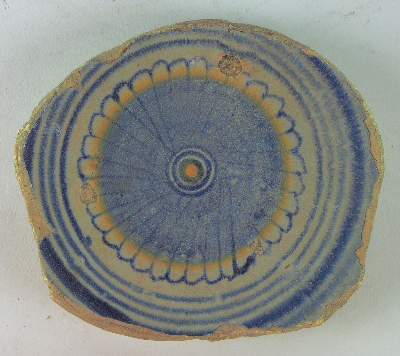 Majolica fragment met op de buitenwand groen loodglazuur. Polychromie in geel en blauw van een rozet. (Nederlands)