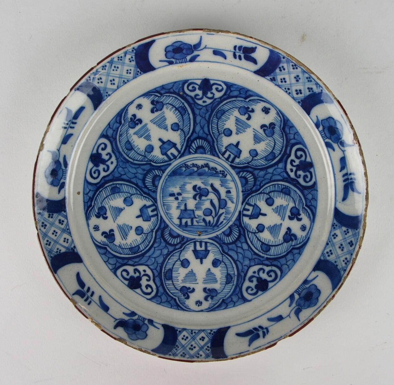 Bord met op het plat medaillons gevuld met decor van huis en bloemmotieven. Op de rand bloemmotief. Op achterzijde in inkt ' J.T. Dextra 1759 eigenaar van de fabriek de A grec' (Nederlands)