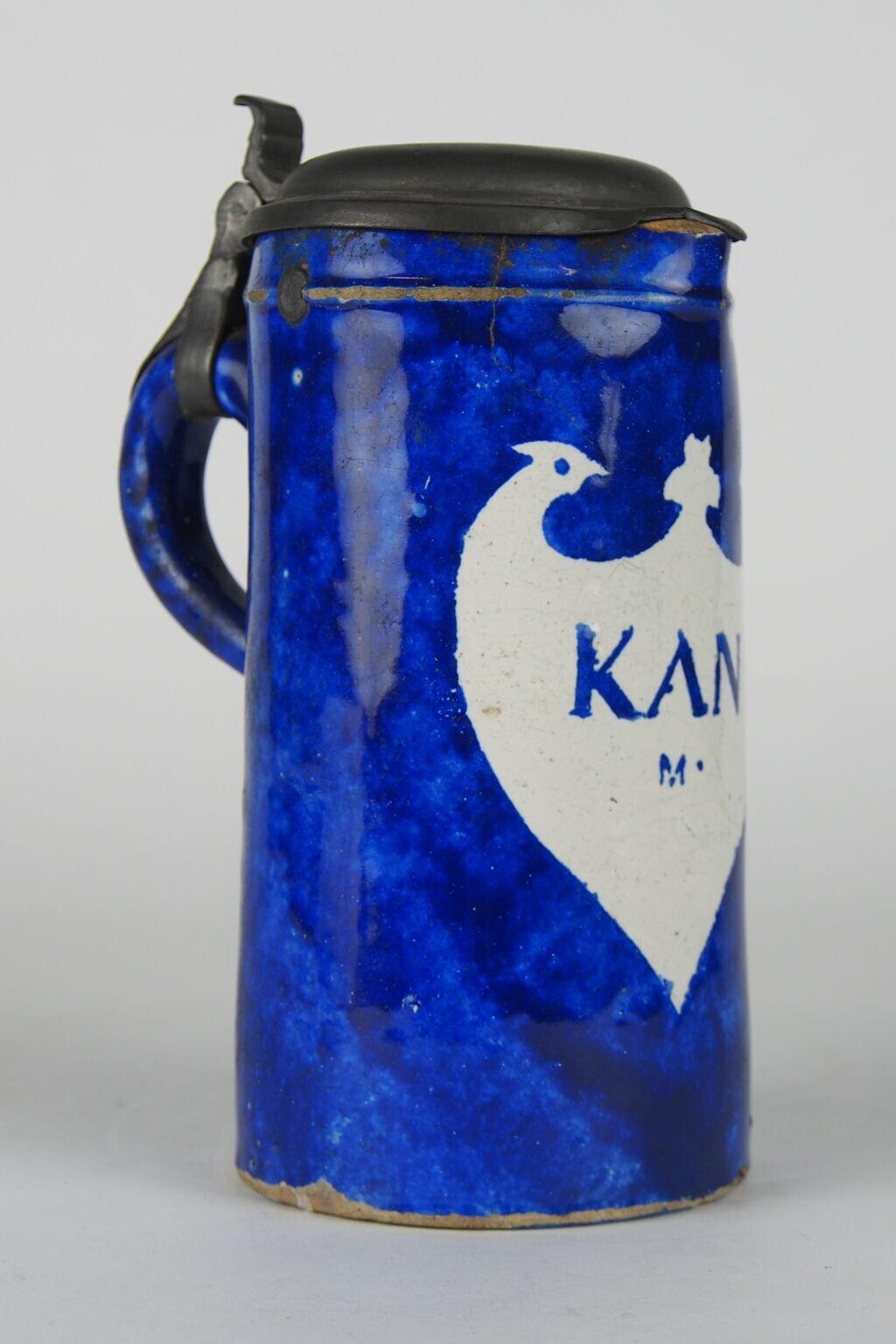 Cilindervormige kan met oor en tinnen deksel. In wit uitgespaard op blauw fond een schild met het opschrift: KAN / N. (Nederlands)