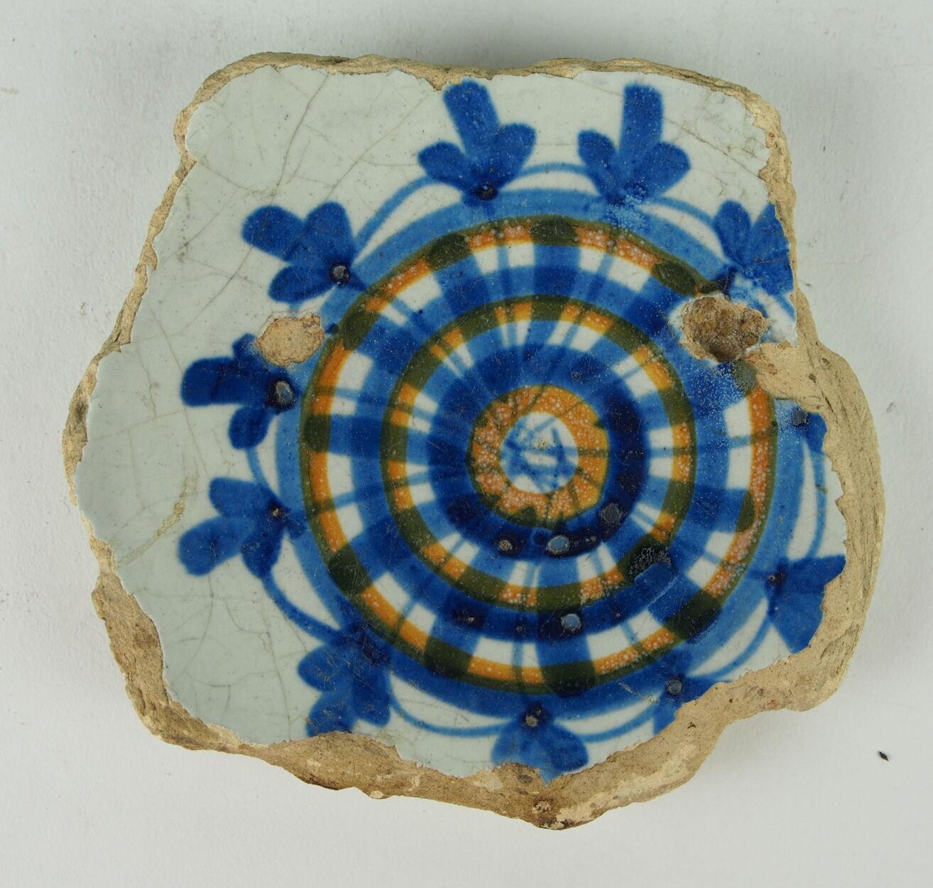 Fragment versierd met een rozet met concentrische en radiale lijnen. Loodglazuur op de buitenkant. (Nederlands)
