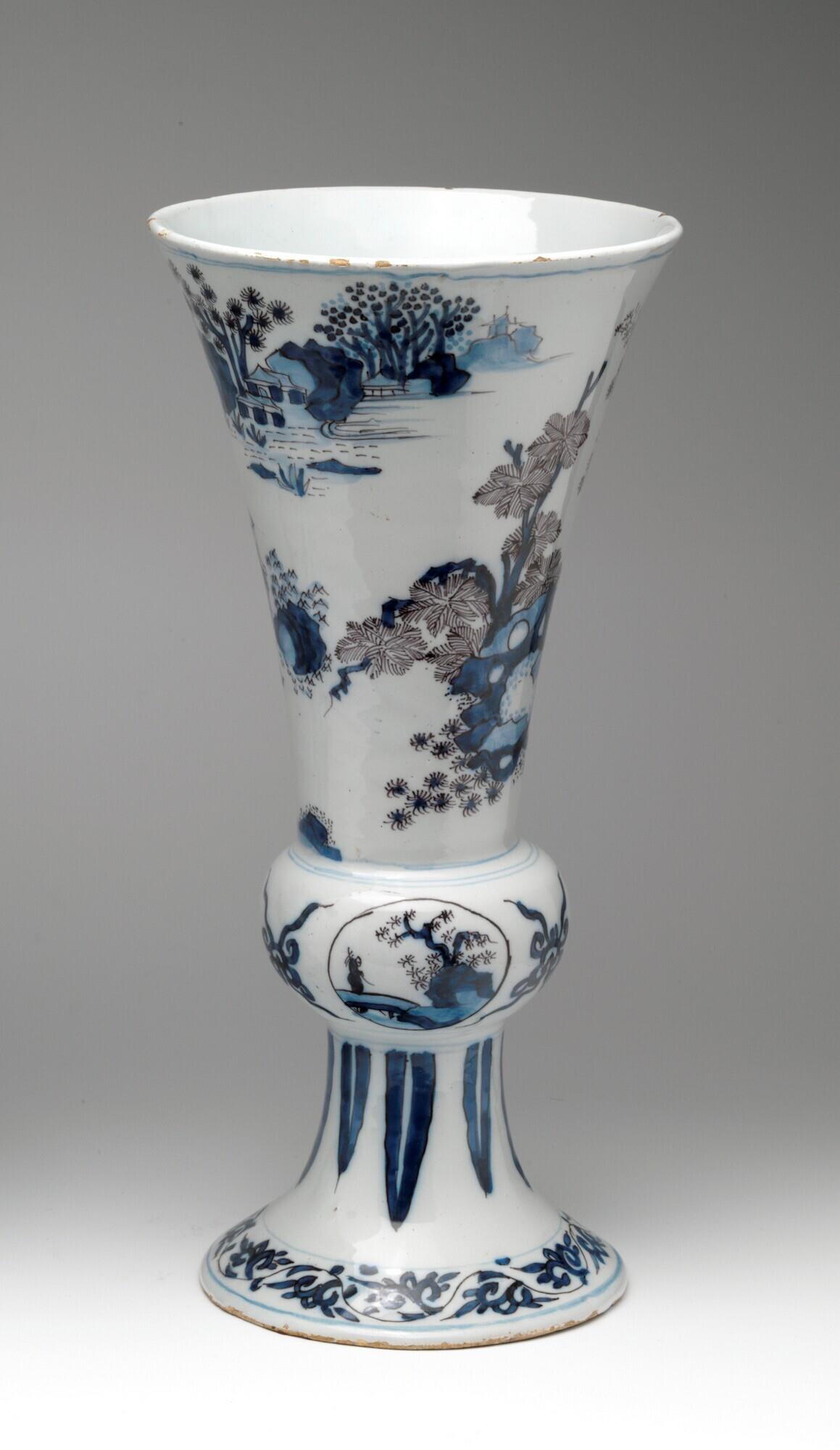 Wijduitlopende, bekervormige vaas op hoge kegelvormige voet met bolle verdikking; op de vaas een voorstelling van Chinezen in berglandschap; op verdikking Chinese paviljoens in medaillons afgewisseld door lint-ornamenten (Nederlands)