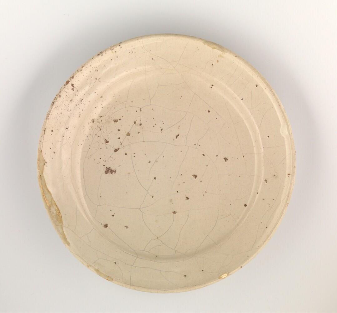 ongedecoreerd, rond met platte voet, smalle rand. Wit tinemail, zonder decor. Eetbord met enkele bakfoutjes. (Nederlands)