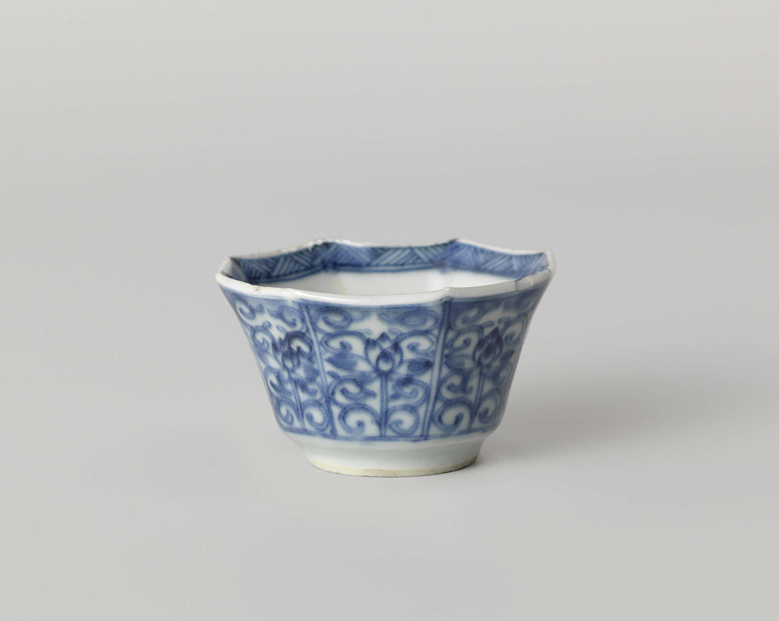 Achthoekige kop van porselein met een spreidende wand, beschilderd in onderglazuur blauw. Op de bodem een bloemtak in een dubbel medaillon; de binnenrand met een band met zigzag-werk. Op de buitenwand acht vakken met gestileerde bloemranken (lotus). Blauw-wit. (Nederlands)