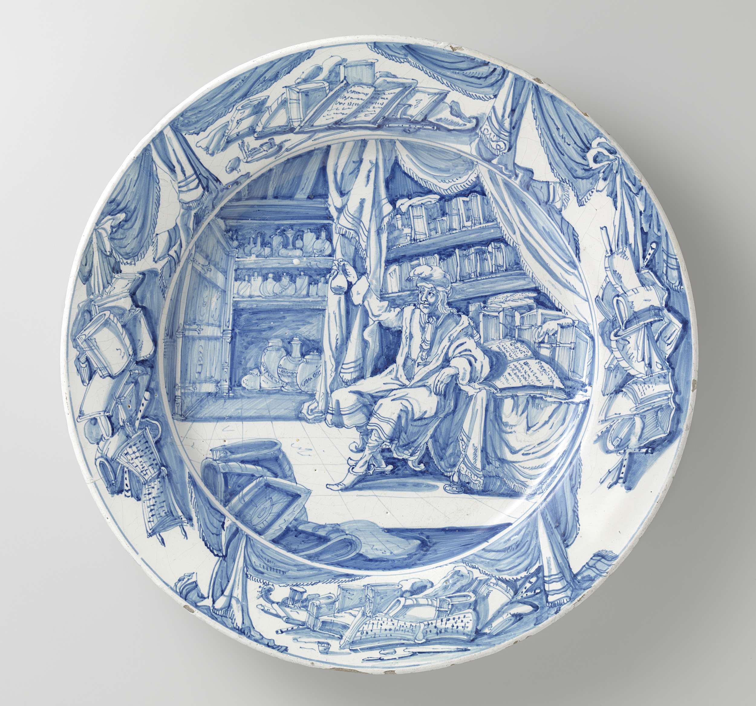 Schotel van faience met een geneesheer in zijn studeervertrek (Nederlands)