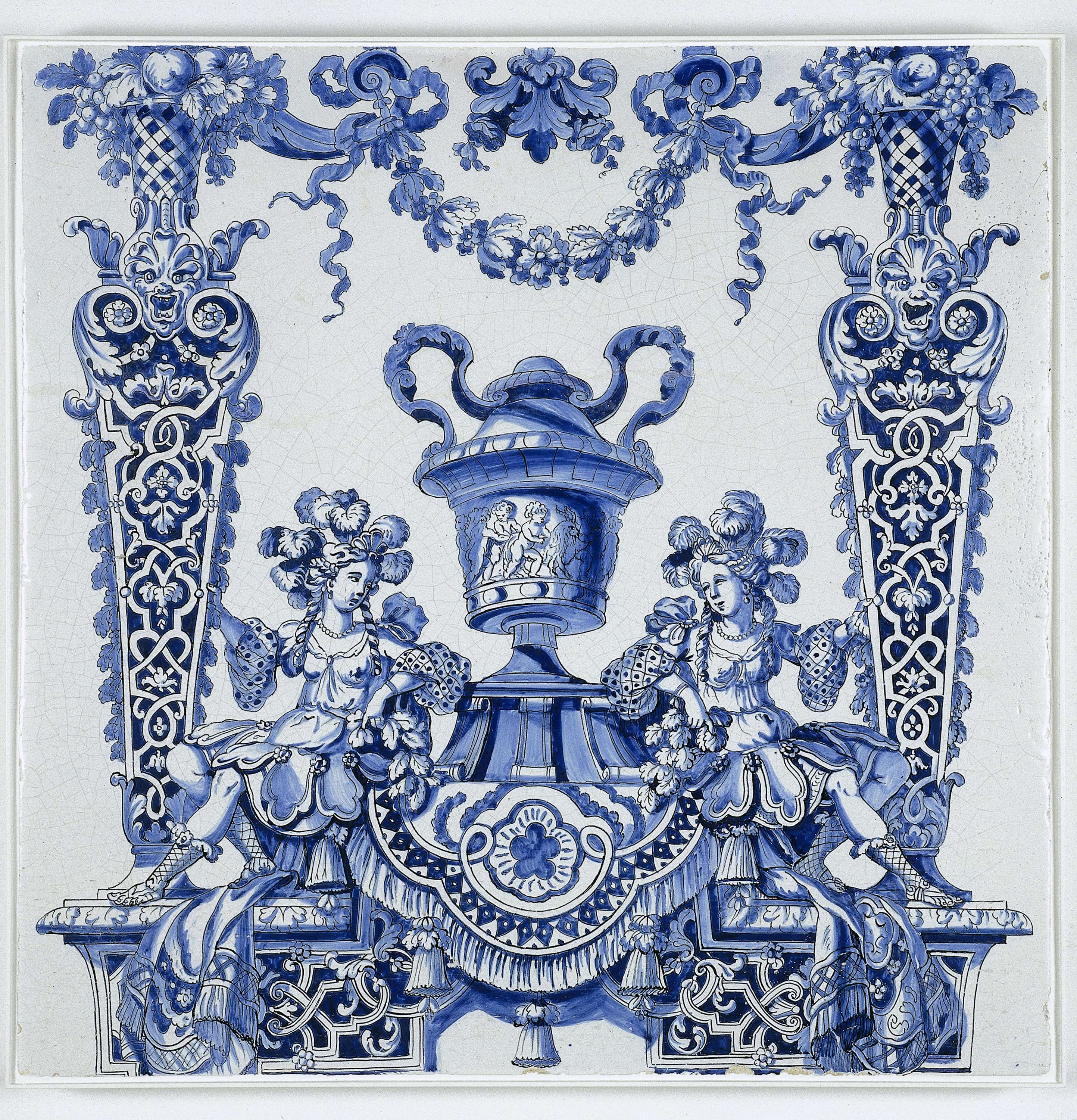 Tegel met een blauwe voorstelling van twee vrouwen aan weerszijden van een vaas. Tussen hen in hangt onder de vaas een drielobbig kleed met drie kwasten. De vaas, welke versierd is met een fries van putti en een bok, staat op een hoog voetstuk met voluten en heeft twee grote oren. Naast de vaas staan pilasters, welke bekroond worden door een masker met een vaas vol vruchten op het hoofd. Tussen de vazen slingers. (Nederlands)