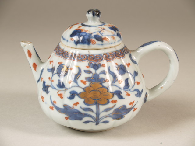 Theepot met geribbelde wand en polychroom floraal decor in Chinese imaristijl (Q25273)